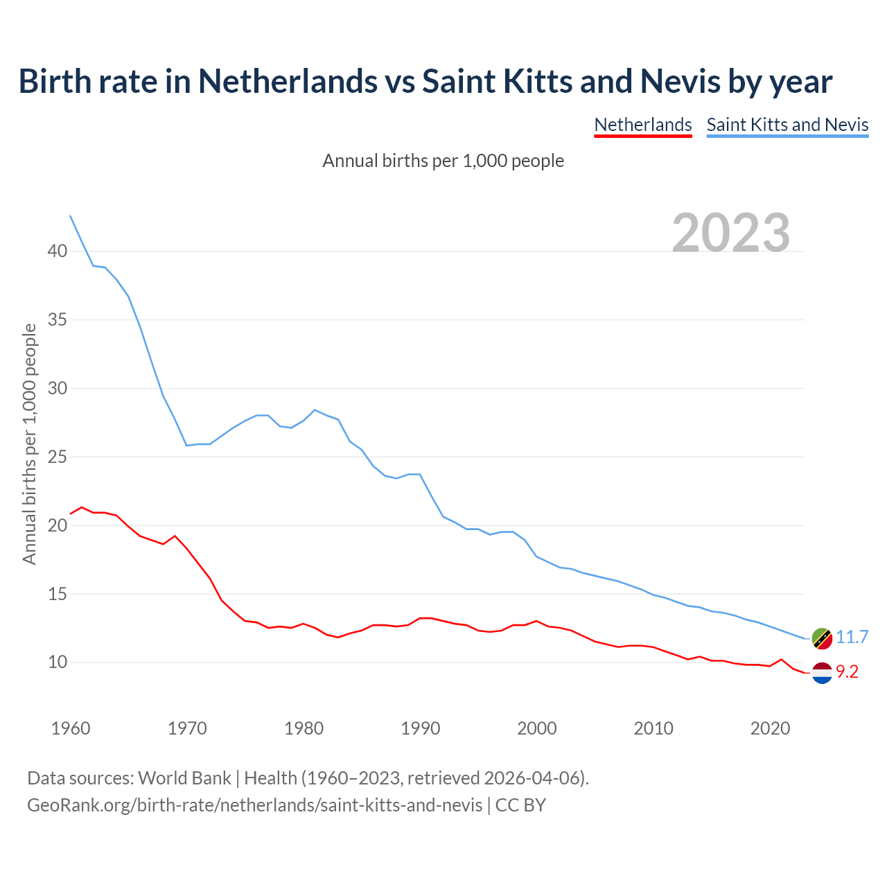 The Netherlands has an annual birth rate of 9.2 births per 1,000 people, compared to 11.7 for Saint Kitts and Nevis. The average number of children a woman is expected to have during her lifetime — the fertility rate, is 1.43 in the Netherlands and 1.51 in Saint Kitts and Nevis — 5.24% difference.