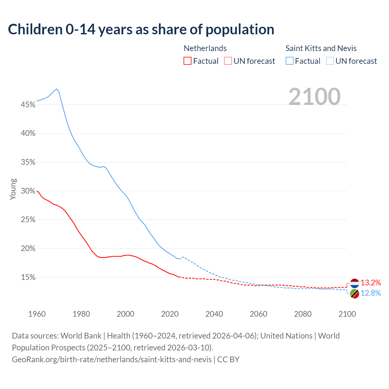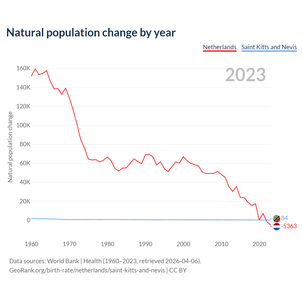 According to the latest available data on birth rates, the fertility rate in the Netherlands was 1.43 children per woman in 2023, compared to 1.51 in Saint Kitts and Nevis in 2023. The replacement level is considered to be 2.1 children per woman.
