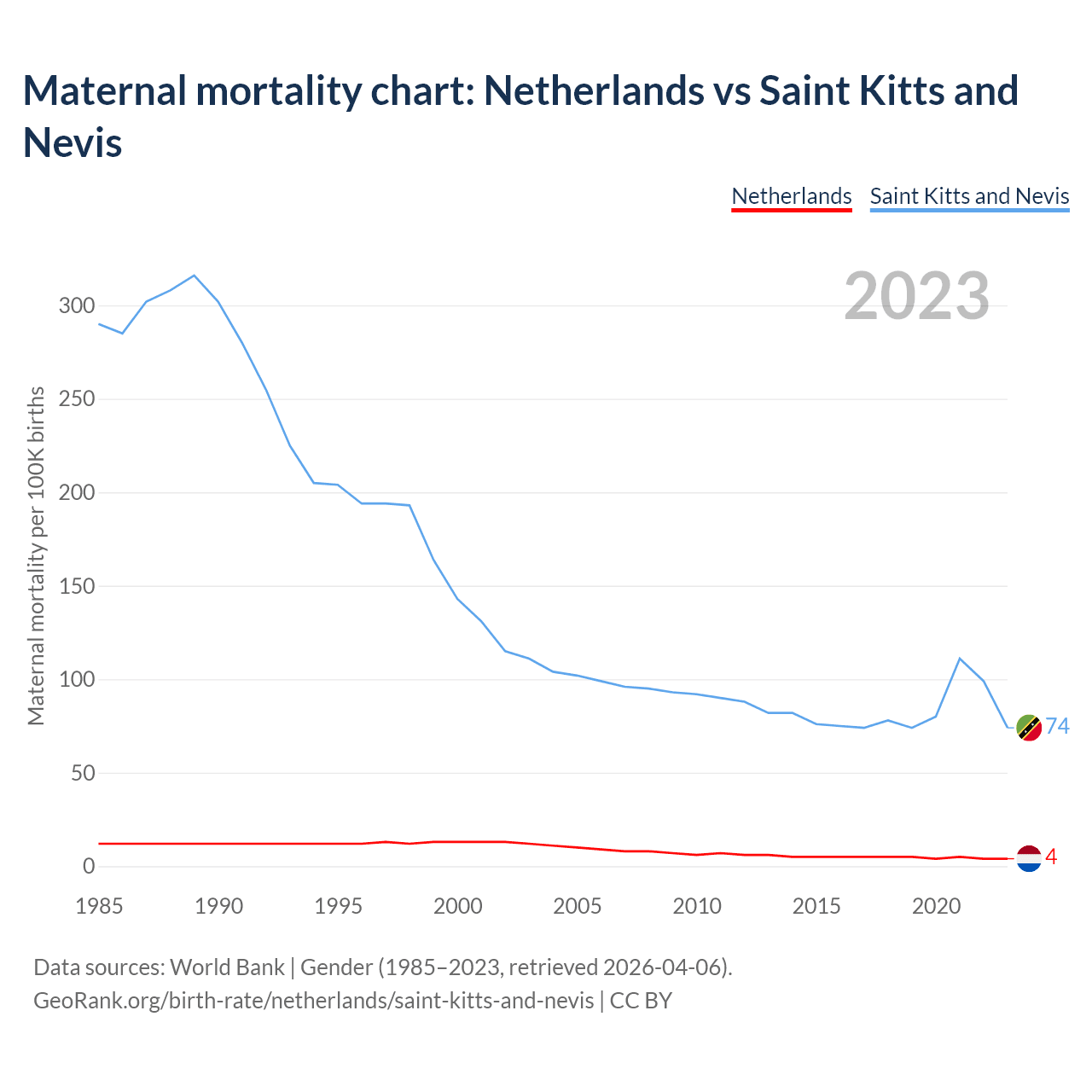The maternal mortality rate, which is the probability of dying during childbirth or within 42 days of pregnancy termination, is 4 deaths per 100,000 live births in the Netherlands, compared to 74 deaths in Saint Kitts and Nevis.