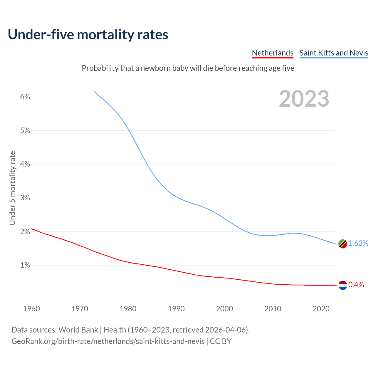 The chance that a newborn baby will die before reaching age five is 0.4% in the Netherlands and 1.63% in Saint Kitts and Nevis. Above is a chart with historical data on under-five mortality rates.