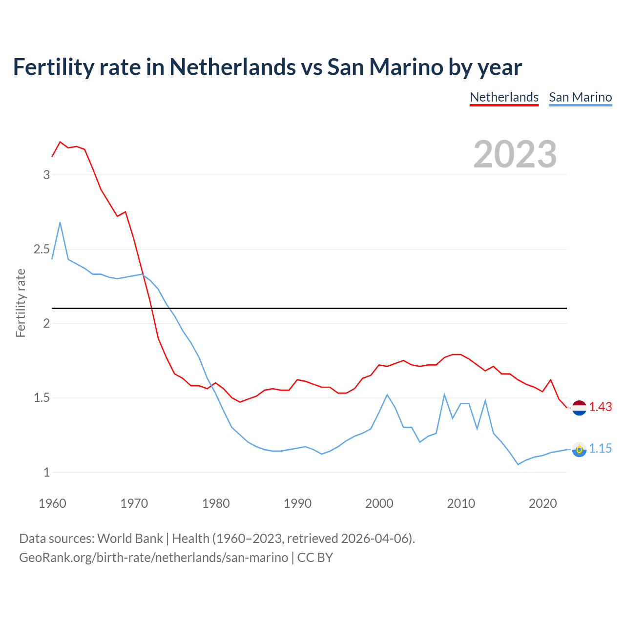 According to the latest available data on birth rates, the fertility rate in the Netherlands was 1.43 children per woman in 2023, compared to 1.15 in San Marino in 2023. The replacement level is considered to be 2.1 children per woman.