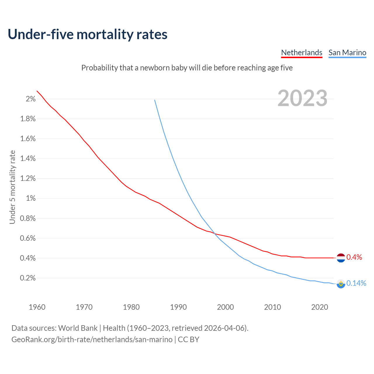 The chance that a newborn baby will die before reaching age five is 0.4% in the Netherlands and 0.14% in San Marino. Above is a chart with historical data on under-five mortality rates.