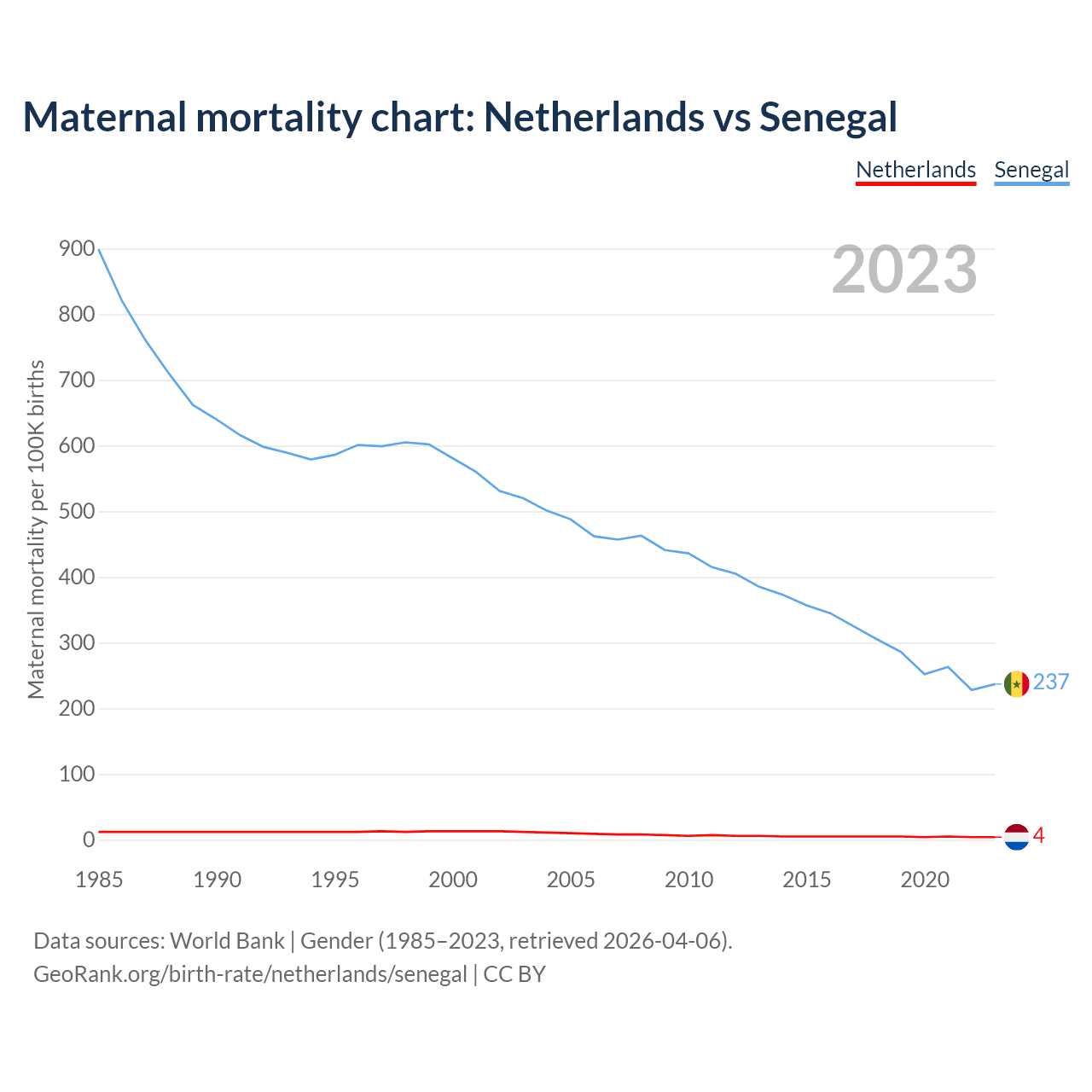 The maternal mortality rate, which is the probability of dying during childbirth or within 42 days of pregnancy termination, is 4 deaths per 100,000 live births in the Netherlands, compared to 237 deaths in Senegal.