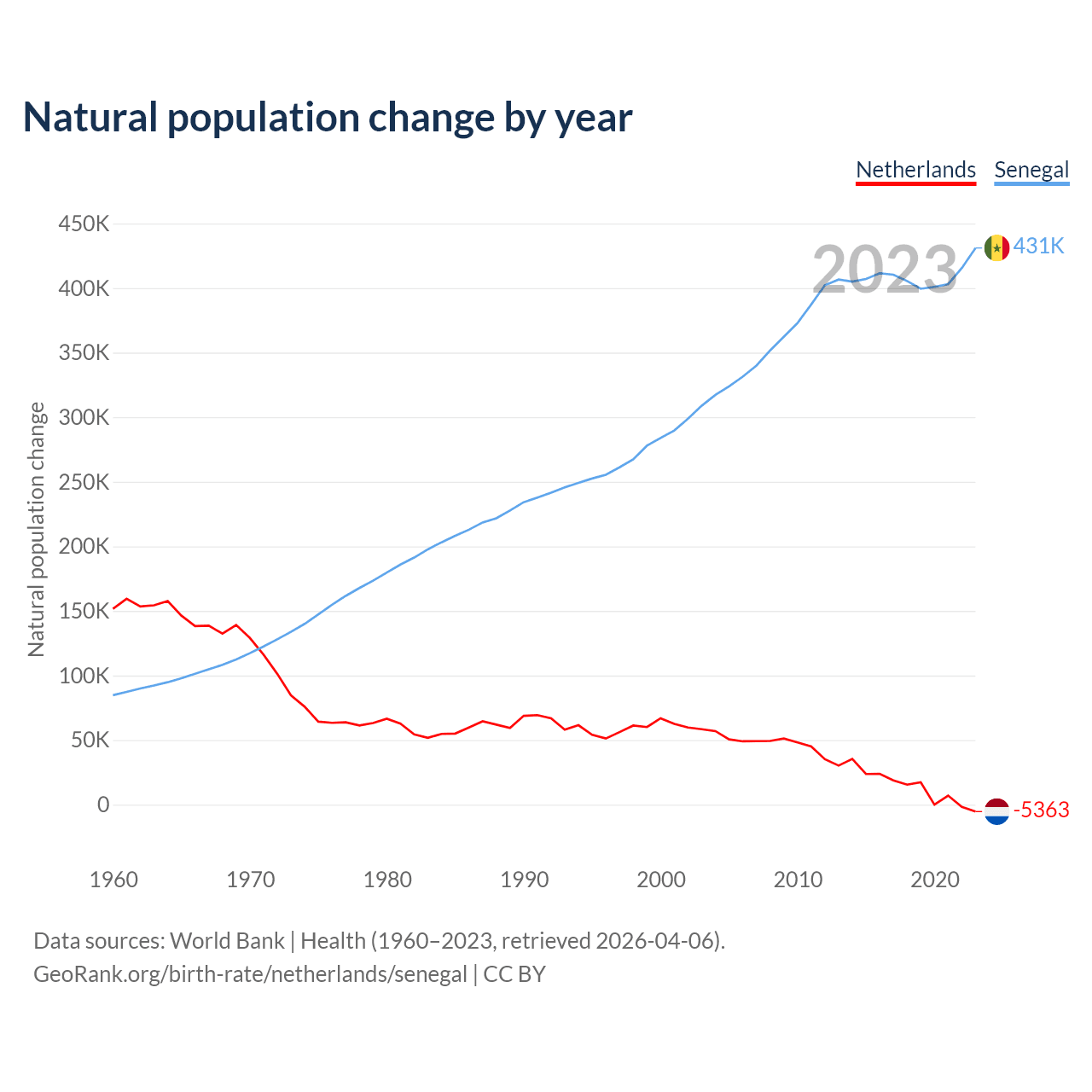 The Netherlands has an annual birth rate of 9.2 births per 1,000 people, compared to 29.4 for Senegal. The average number of children a woman is expected to have during her lifetime — the fertility rate, is 1.43 in the Netherlands and 3.82 in Senegal — 167% difference.