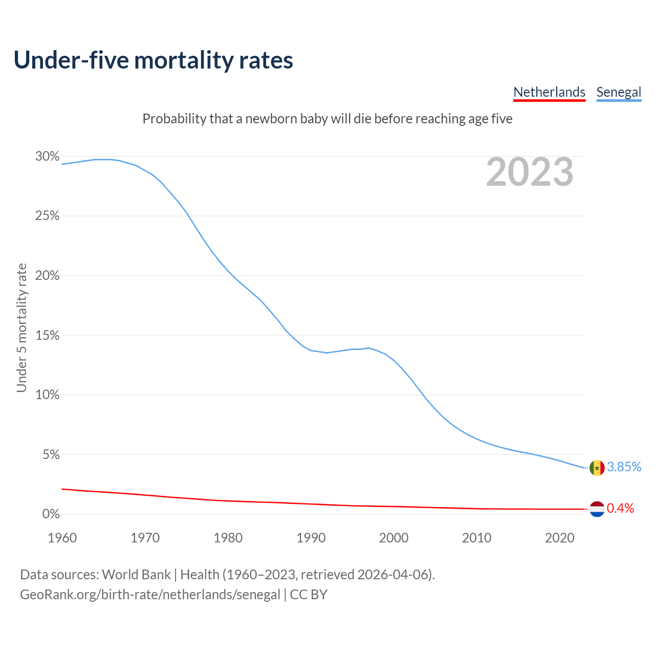 The chance that a newborn baby will die before reaching age five is 0.4% in the Netherlands and 3.85% in Senegal. Above is a chart with historical data on under-five mortality rates.