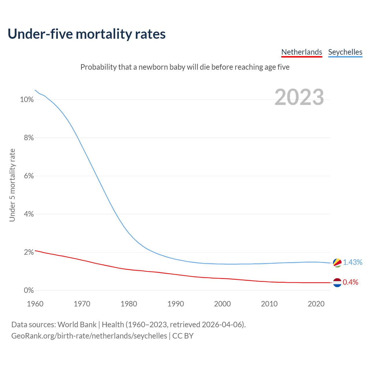 The chance that a newborn baby will die before reaching age five is 0.4% in the Netherlands and 1.43% in the Seychelles. Above is a chart with historical data on under-five mortality rates.