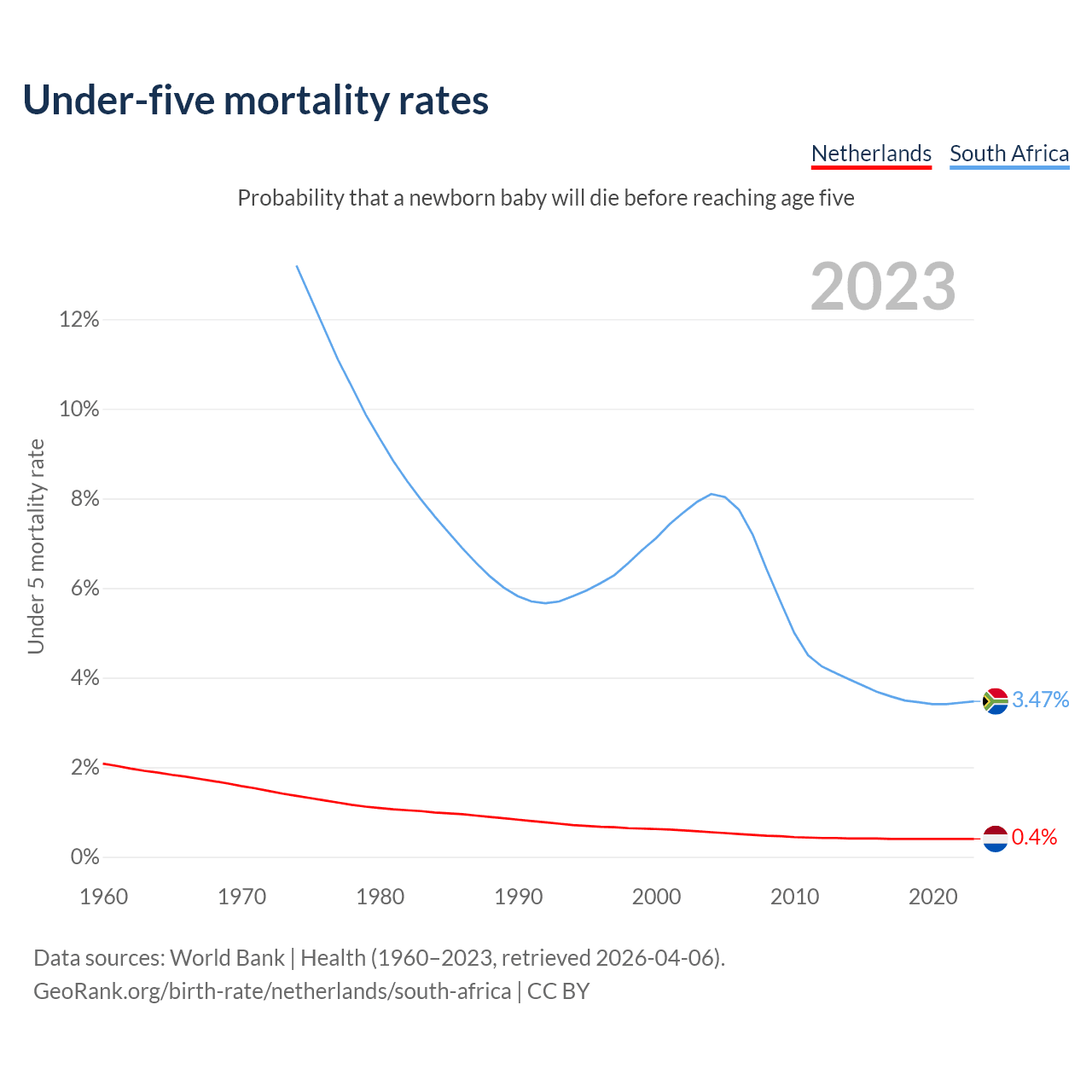 The chance that a newborn baby will die before reaching age five is 0.4% in the Netherlands and 3.47% in South Africa. Above is a chart with historical data on under-five mortality rates.