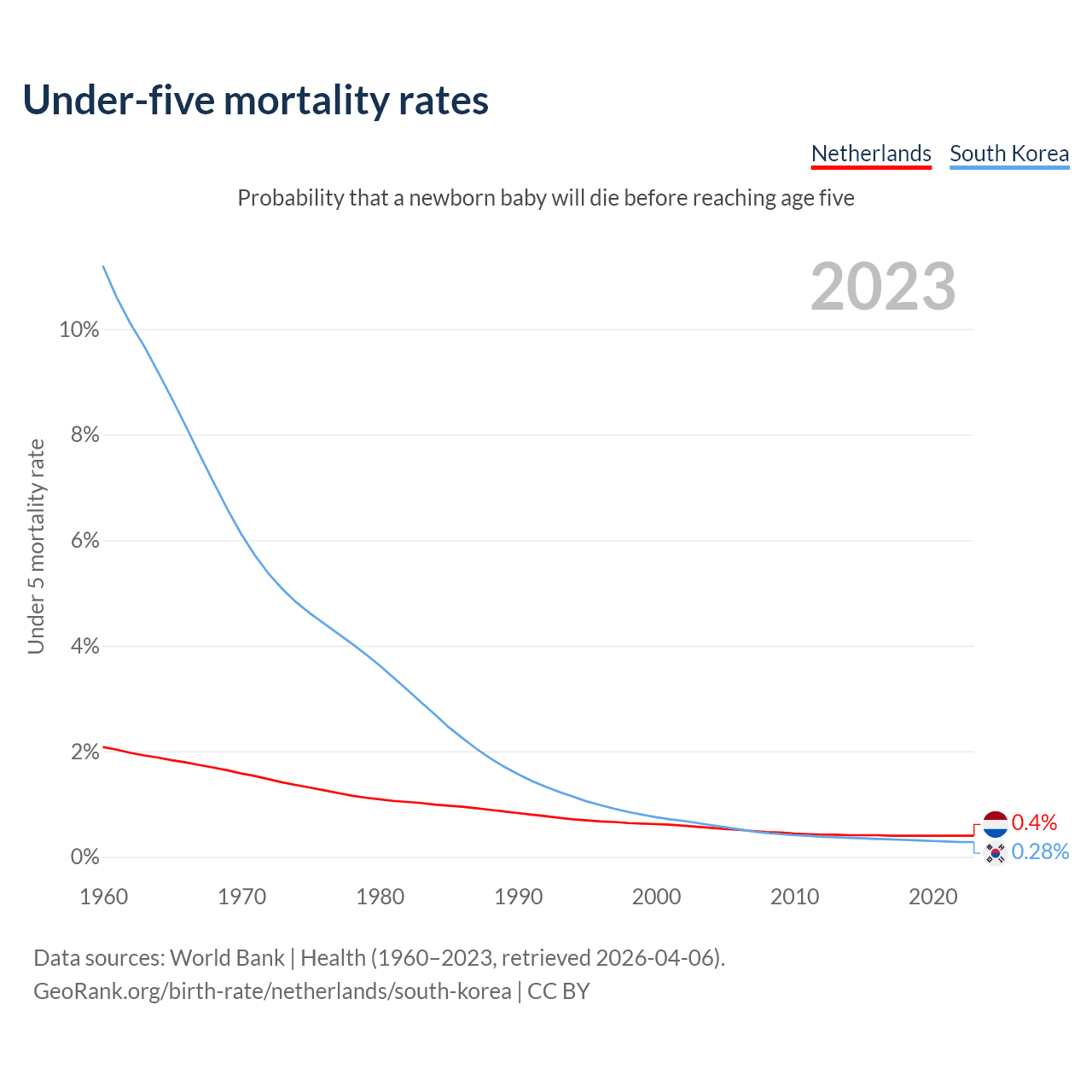 The chance that a newborn baby will die before reaching age five is 0.4% in the Netherlands and 0.28% in South Korea. Above is a chart with historical data on under-five mortality rates.