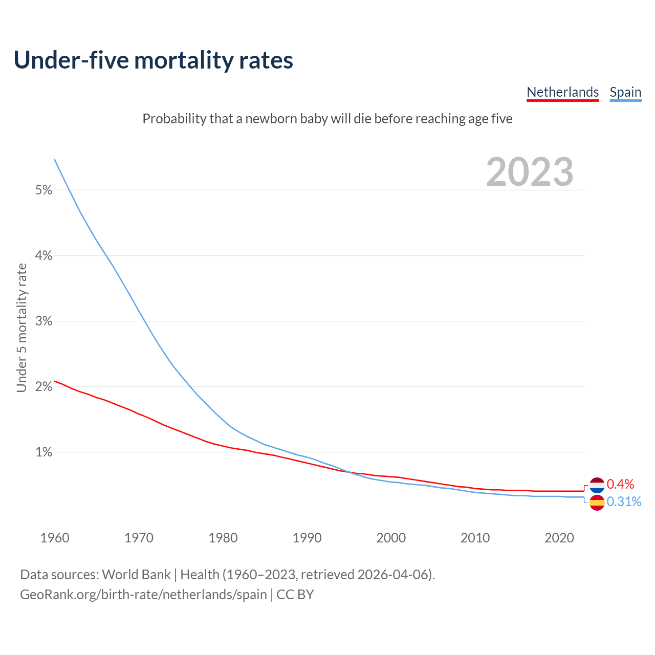 The chance that a newborn baby will die before reaching age five is 0.4% in the Netherlands and 0.31% in Spain. Above is a chart with historical data on under-five mortality rates.