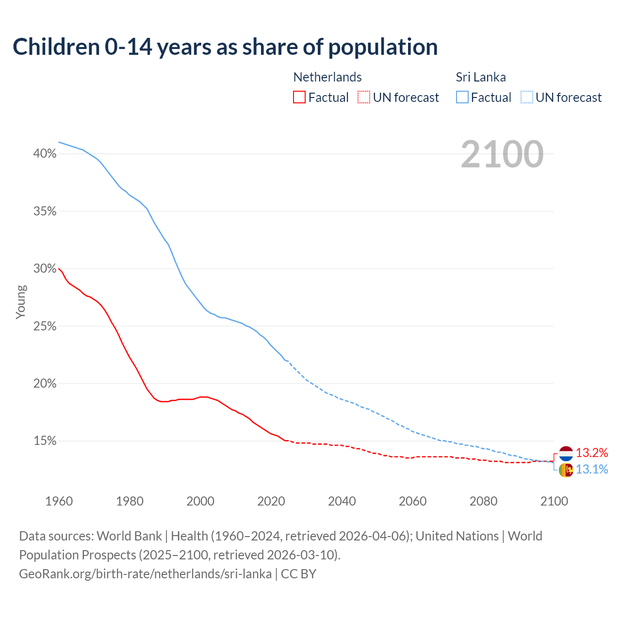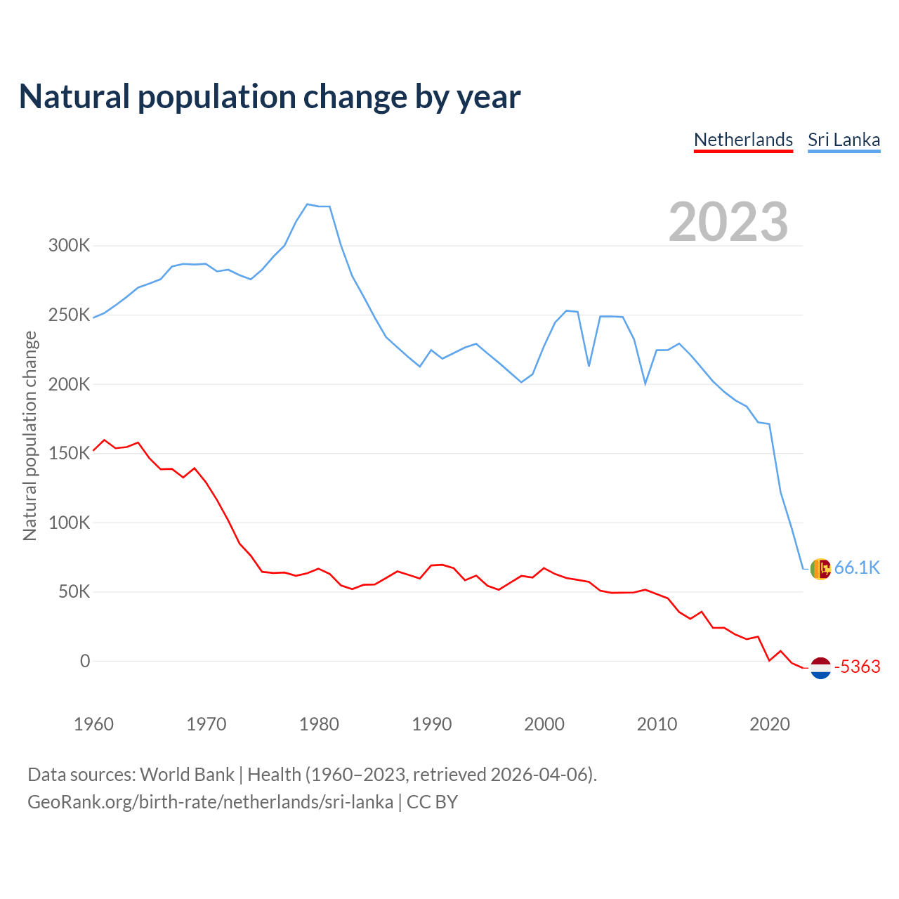 The Netherlands has an annual birth rate of 9.2 births per 1,000 people, compared to 11.2 for Sri Lanka. The average number of children a woman is expected to have during her lifetime — the fertility rate, is 1.43 in the Netherlands and 1.97 in Sri Lanka — 38% difference.