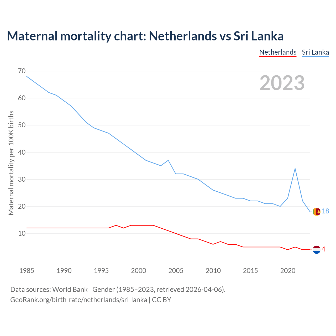 The maternal mortality rate, which is the probability of dying during childbirth or within 42 days of pregnancy termination, is 4 deaths per 100,000 live births in the Netherlands, compared to 18 deaths in Sri Lanka.