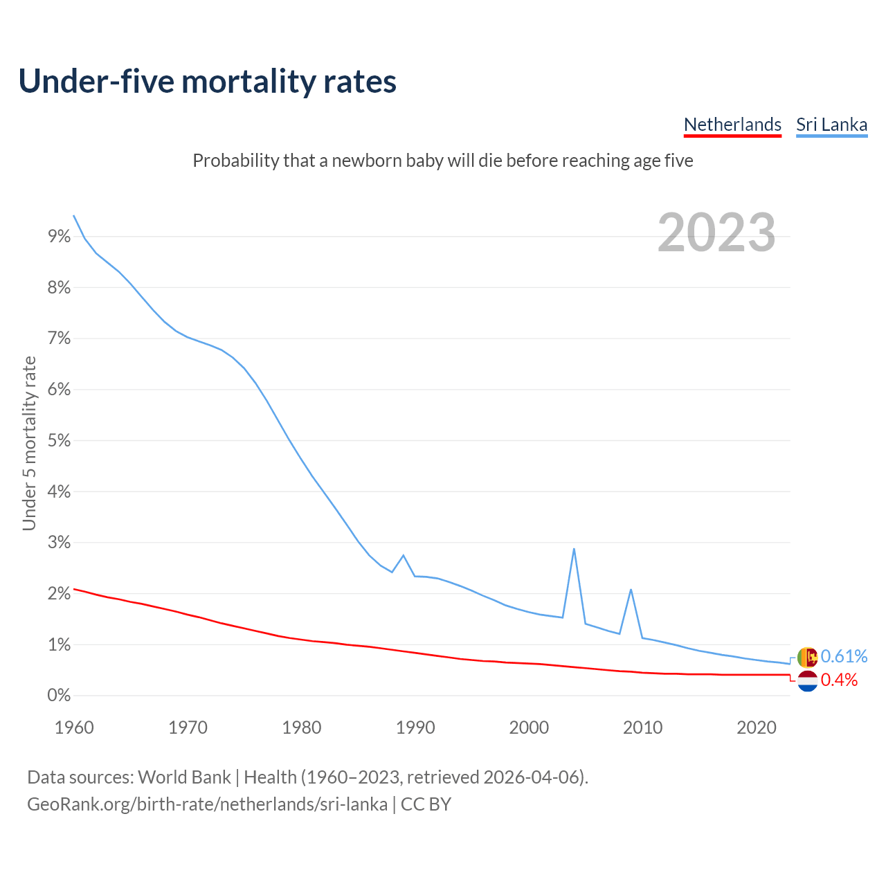 The chance that a newborn baby will die before reaching age five is 0.4% in the Netherlands and 0.61% in Sri Lanka. Above is a chart with historical data on under-five mortality rates.