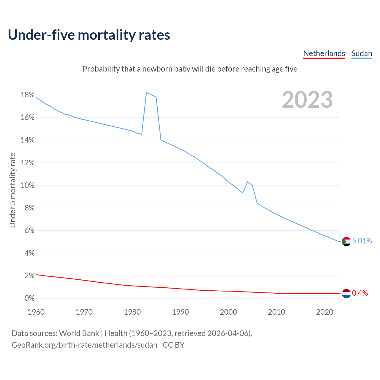 The chance that a newborn baby will die before reaching age five is 0.4% in the Netherlands and 5.01% in Sudan. Above is a chart with historical data on under-five mortality rates.