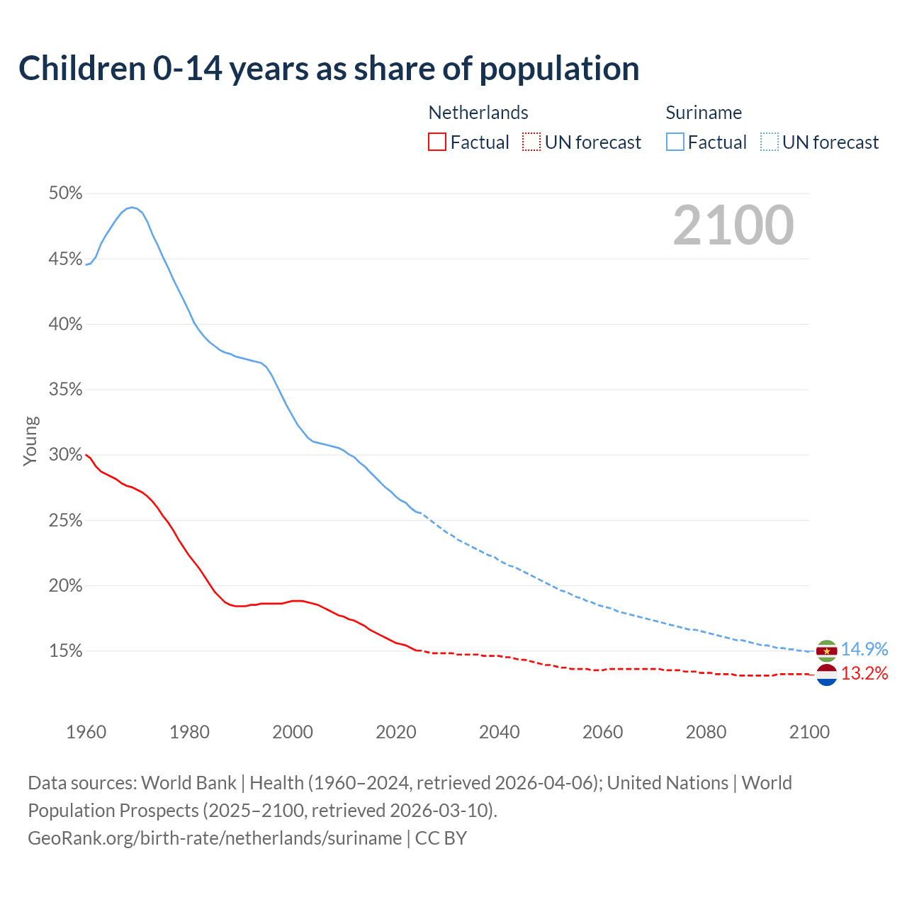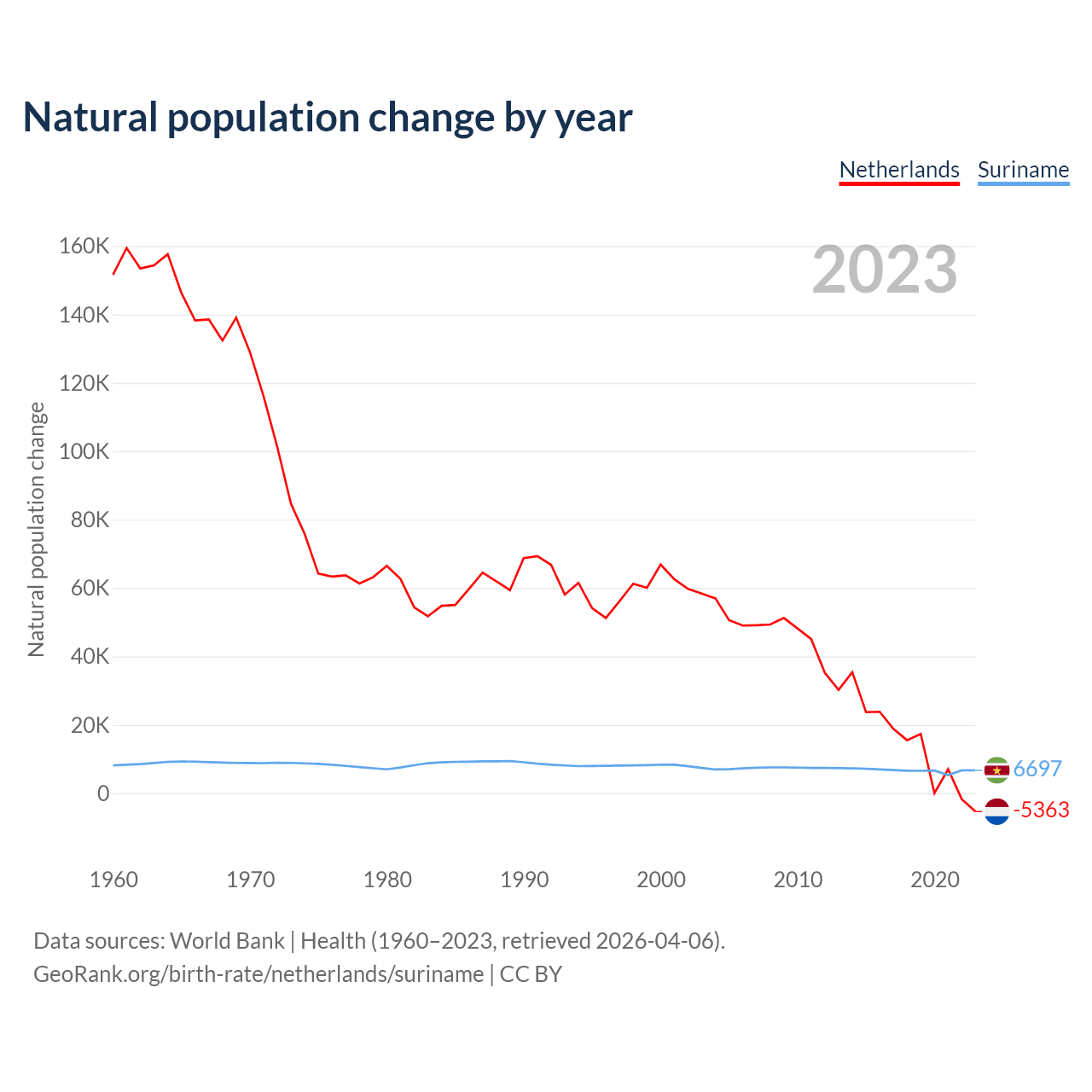 According to the latest available data on birth rates, the fertility rate in the Netherlands was 1.43 children per woman in 2023, compared to 2.25 in Suriname in 2023. The replacement level is considered to be 2.1 children per woman.
