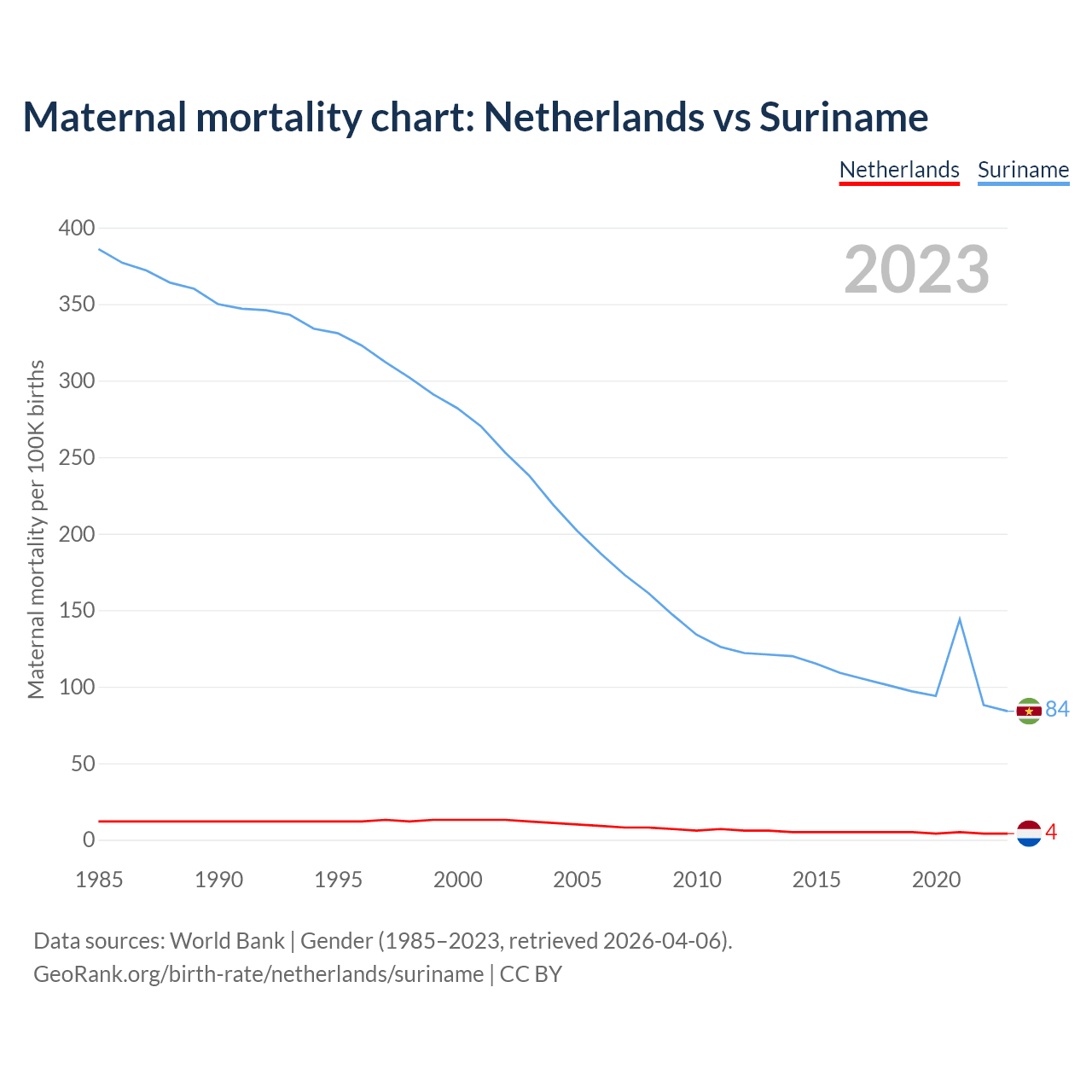The maternal mortality rate, which is the probability of dying during childbirth or within 42 days of pregnancy termination, is 4 deaths per 100,000 live births in the Netherlands, compared to 84 deaths in Suriname.