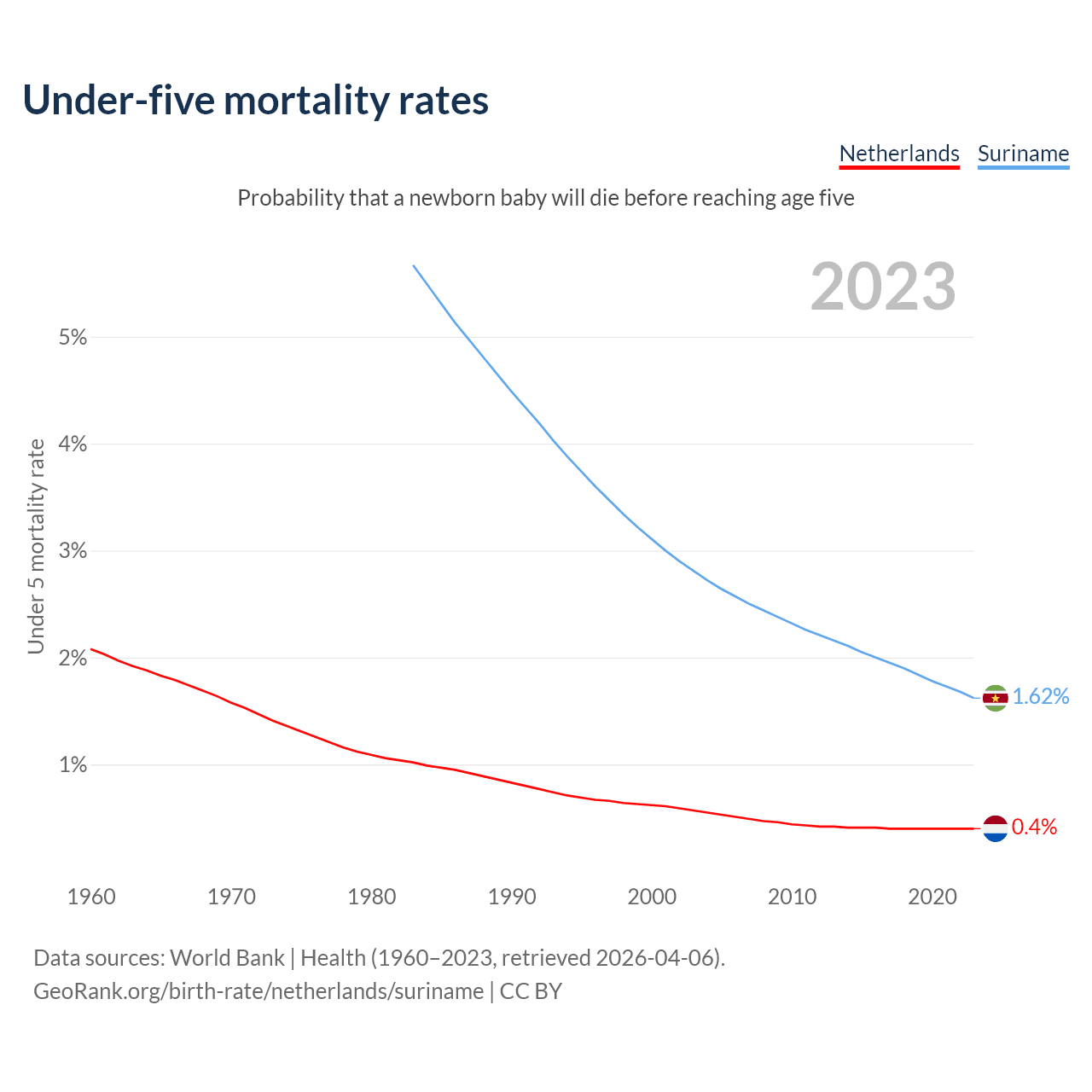 The chance that a newborn baby will die before reaching age five is 0.4% in the Netherlands and 1.62% in Suriname. Above is a chart with historical data on under-five mortality rates.