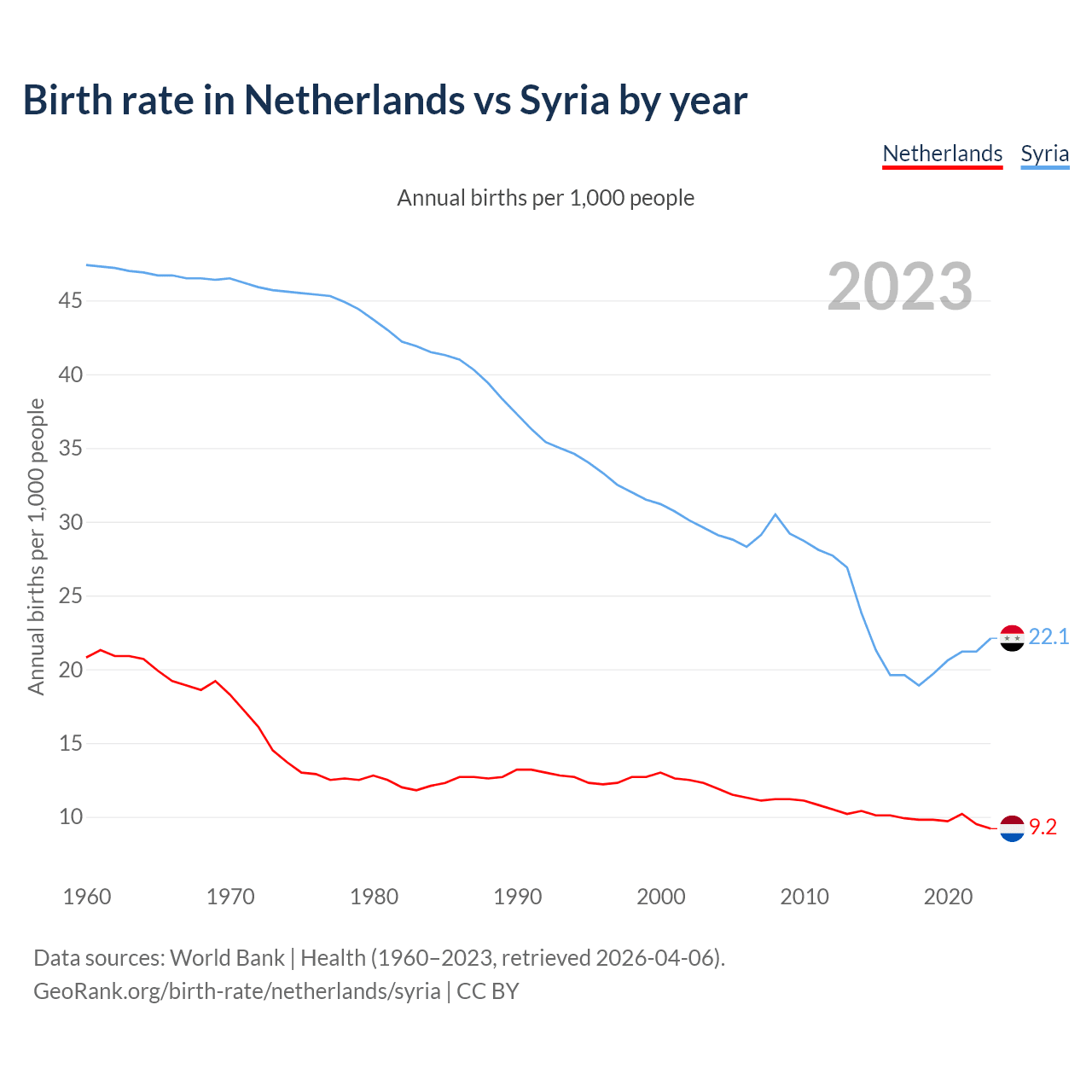 The Netherlands has an annual birth rate of 9.2 births per 1,000 people, compared to 22.1 for Syria. The average number of children a woman is expected to have during her lifetime — the fertility rate, is 1.43 in the Netherlands and 2.71 in Syria — 89.7% difference.
