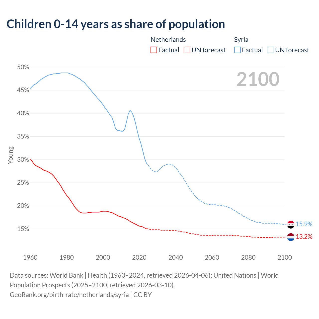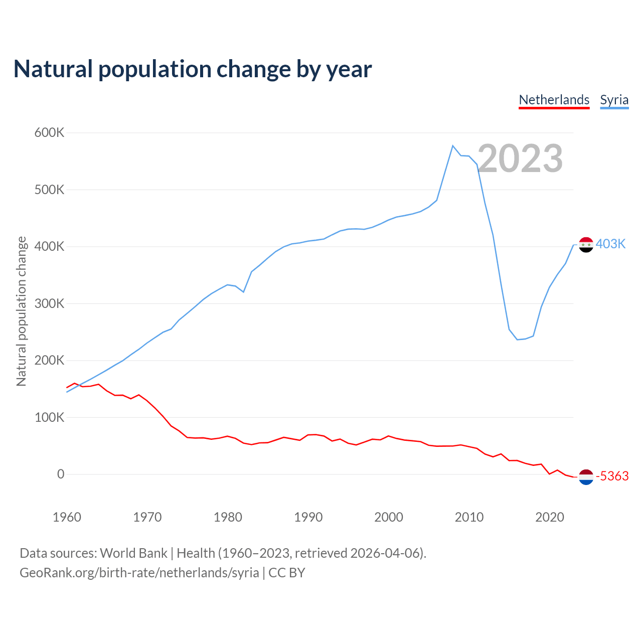 According to the latest available data on birth rates, the fertility rate in the Netherlands was 1.43 children per woman in 2023, compared to 2.71 in Syria in 2023. The replacement level is considered to be 2.1 children per woman.