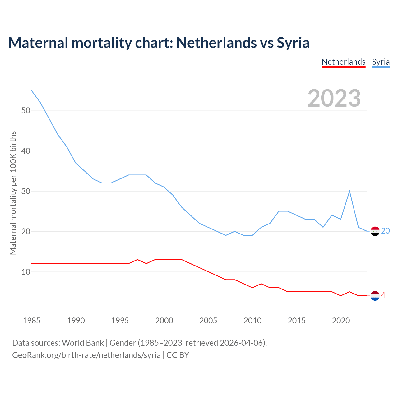 The maternal mortality rate, which is the probability of dying during childbirth or within 42 days of pregnancy termination, is 4 deaths per 100,000 live births in the Netherlands, compared to 20 deaths in Syria.