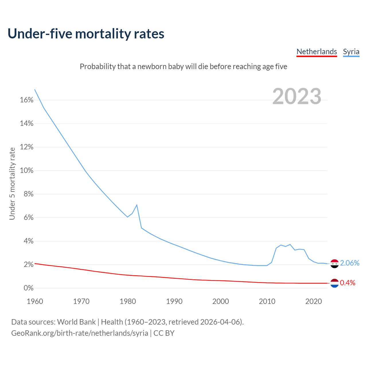 The chance that a newborn baby will die before reaching age five is 0.4% in the Netherlands and 2.06% in Syria. Above is a chart with historical data on under-five mortality rates.
