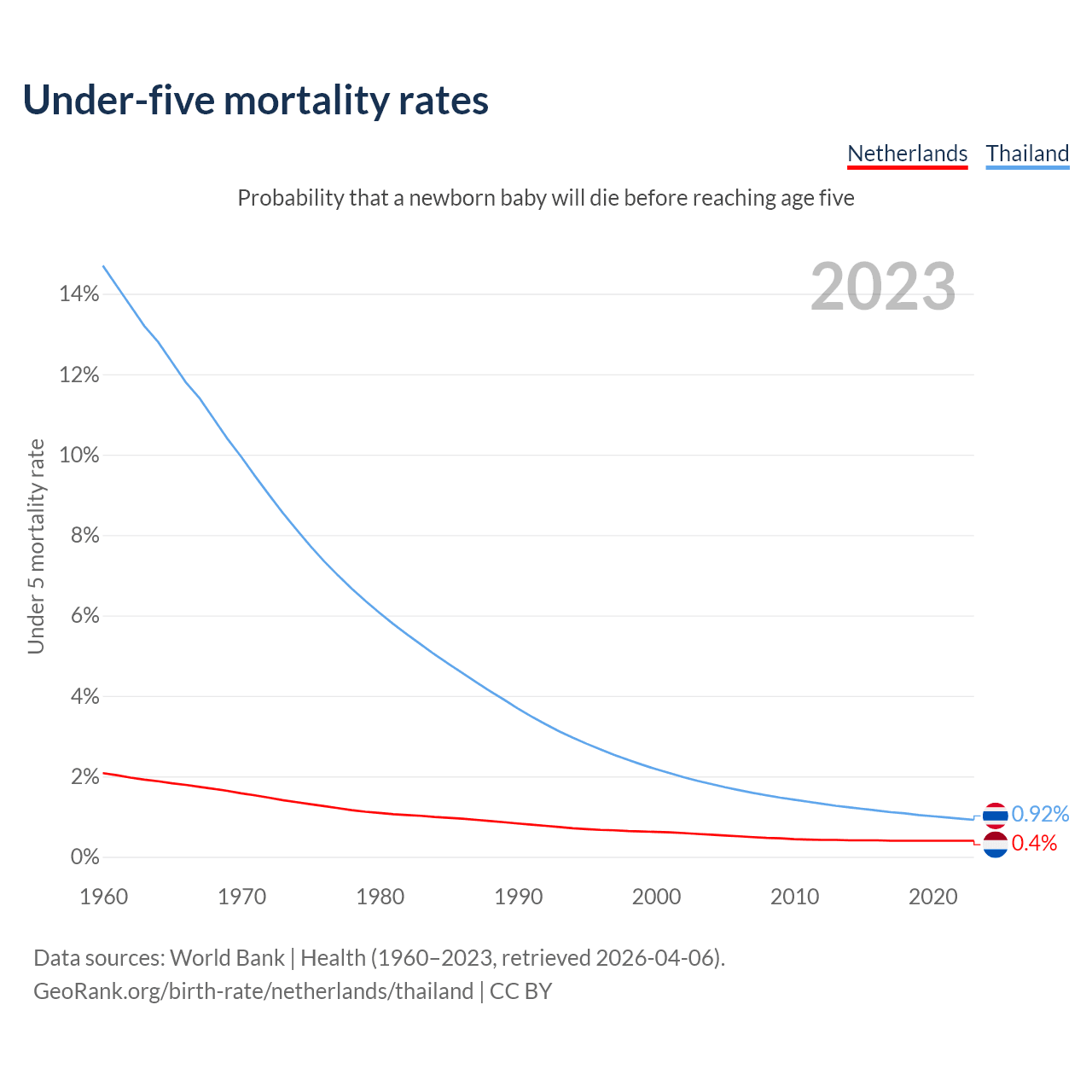 The chance that a newborn baby will die before reaching age five is 0.4% in the Netherlands and 0.92% in Thailand. Above is a chart with historical data on under-five mortality rates.