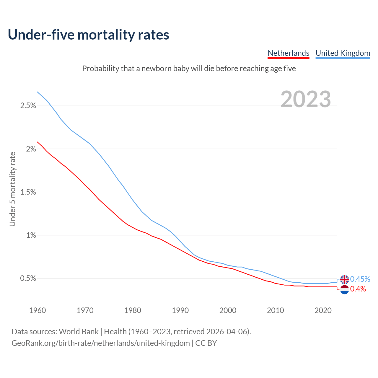 The chance that a newborn baby will die before reaching age five is 0.4% in the Netherlands and 0.45% in the United Kingdom. Above is a chart with historical data on under-five mortality rates.