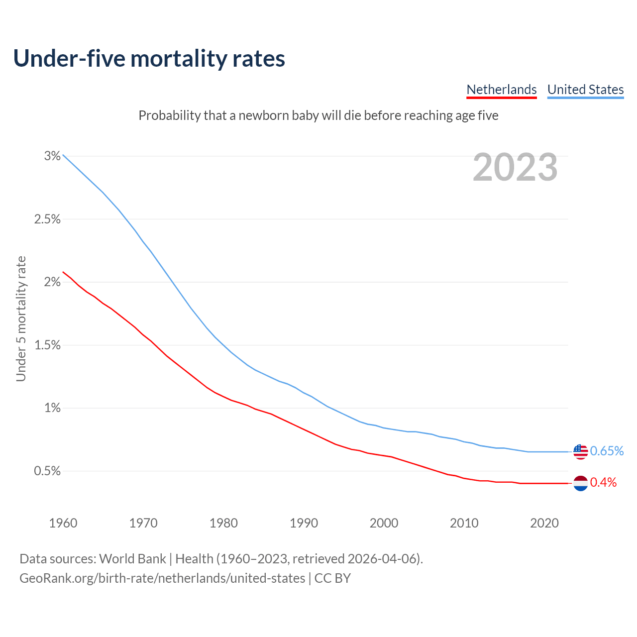 The chance that a newborn baby will die before reaching age five is 0.4% in the Netherlands and 0.65% in the United States. Above is a chart with historical data on under-five mortality rates.
