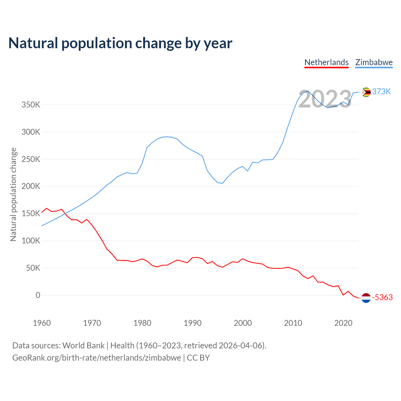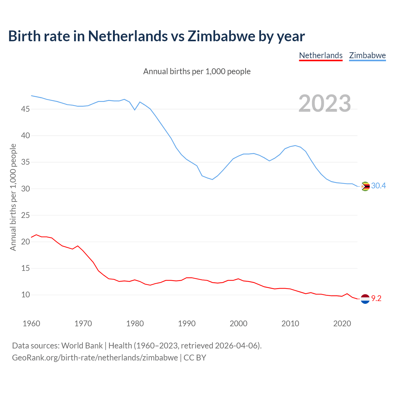 The Netherlands has an annual birth rate of 9.2 births per 1,000 people, compared to 30.4 for Zimbabwe. The average number of children a woman is expected to have during her lifetime — the fertility rate, is 1.43 in the Netherlands and 3.72 in Zimbabwe — 160.4% difference.