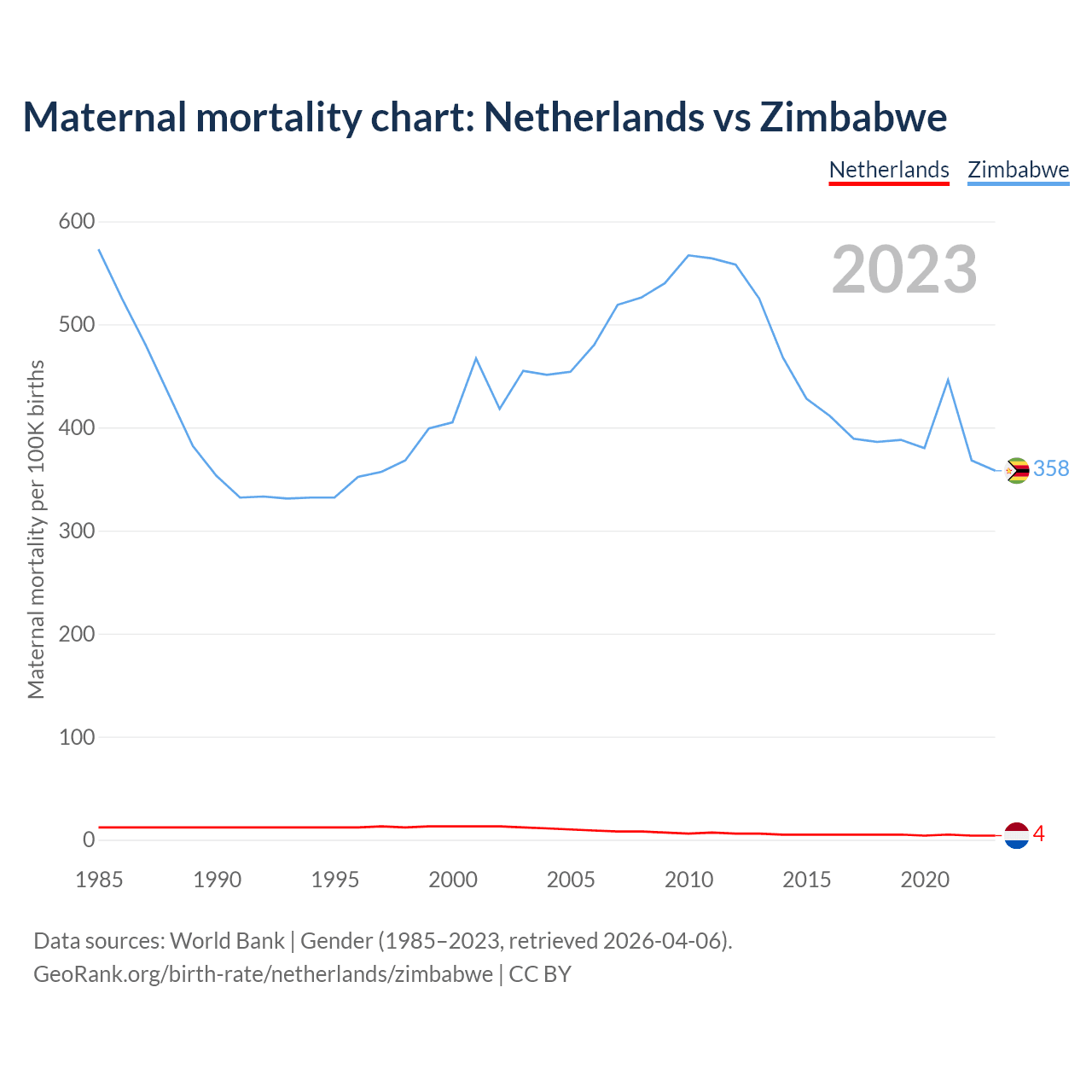 The maternal mortality rate, which is the probability of dying during childbirth or within 42 days of pregnancy termination, is 4 deaths per 100,000 live births in the Netherlands, compared to 358 deaths in Zimbabwe.