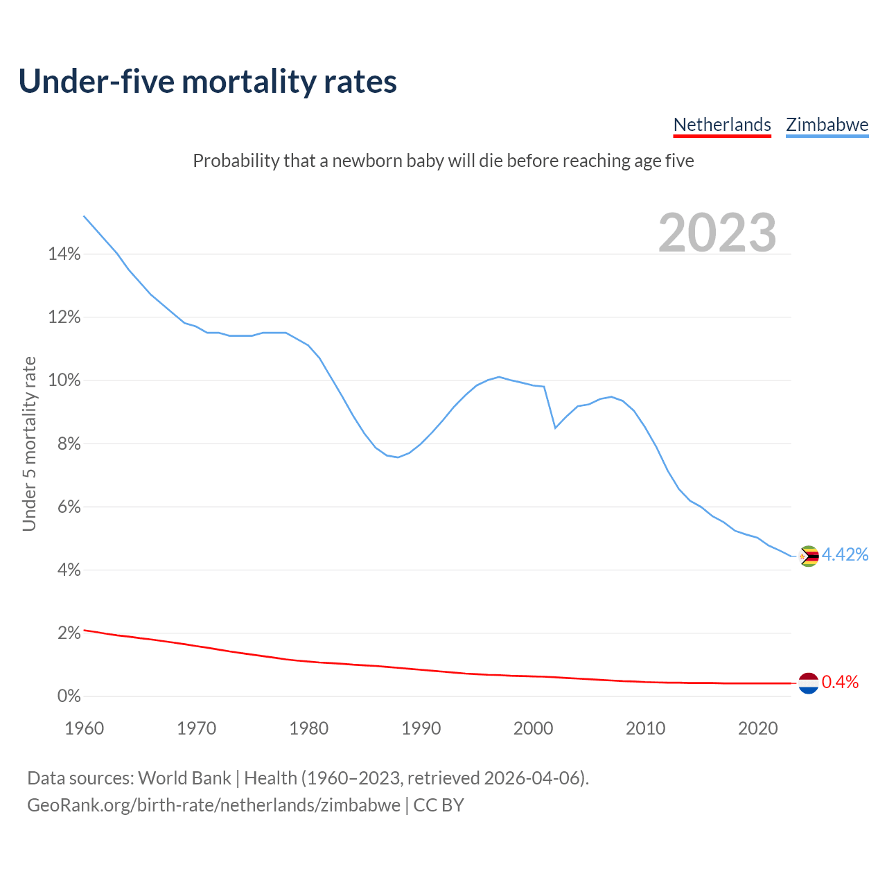 The chance that a newborn baby will die before reaching age five is 0.4% in the Netherlands and 4.42% in Zimbabwe. Above is a chart with historical data on under-five mortality rates.