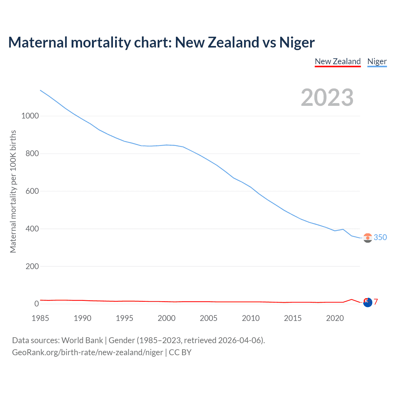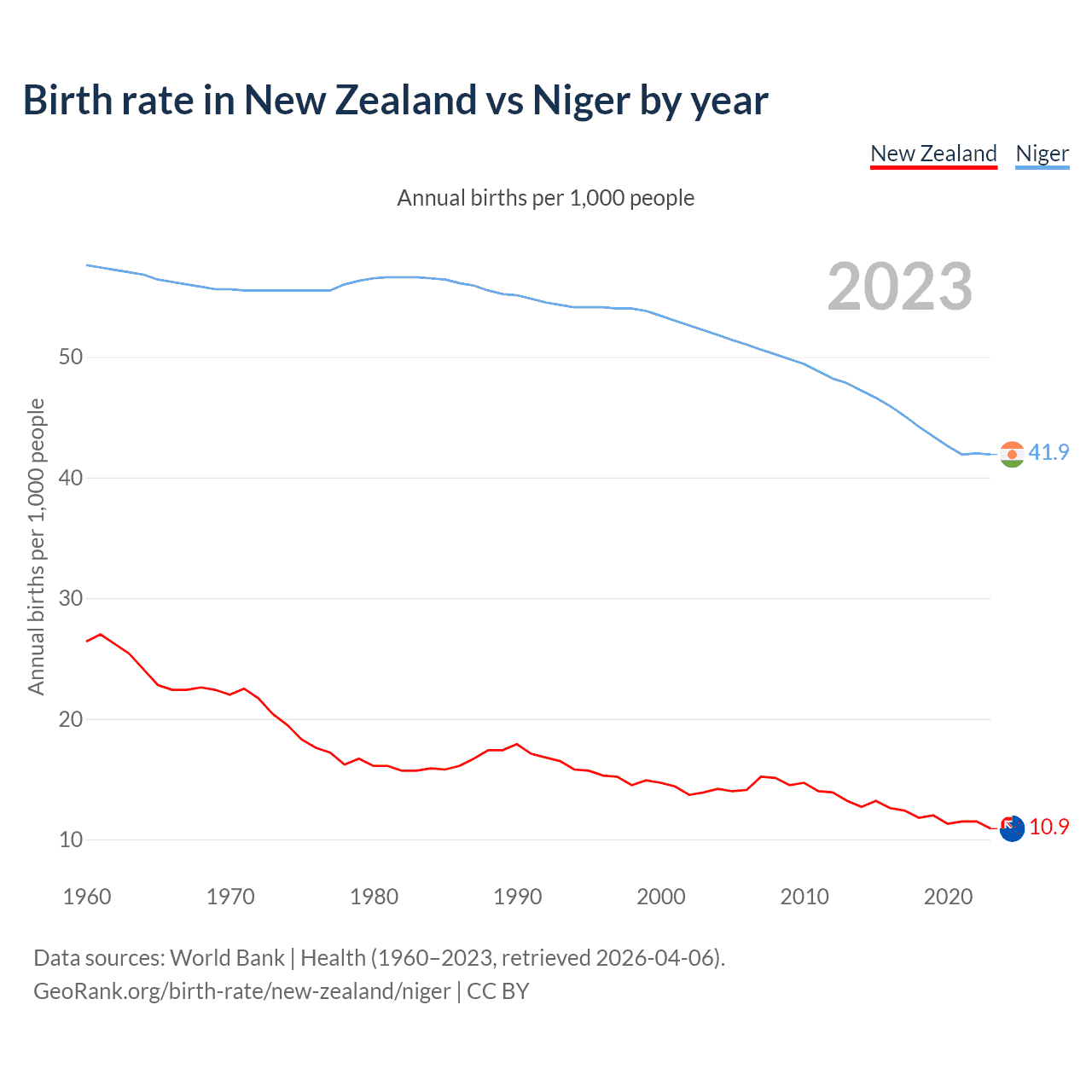 New Zealand has an annual birth rate of 10.9 births per 1,000 people, compared to 41.9 for Niger. The average number of children a woman is expected to have during her lifetime — the fertility rate, is 1.56 in New Zealand and 6.06 in Niger — 288.5% difference.