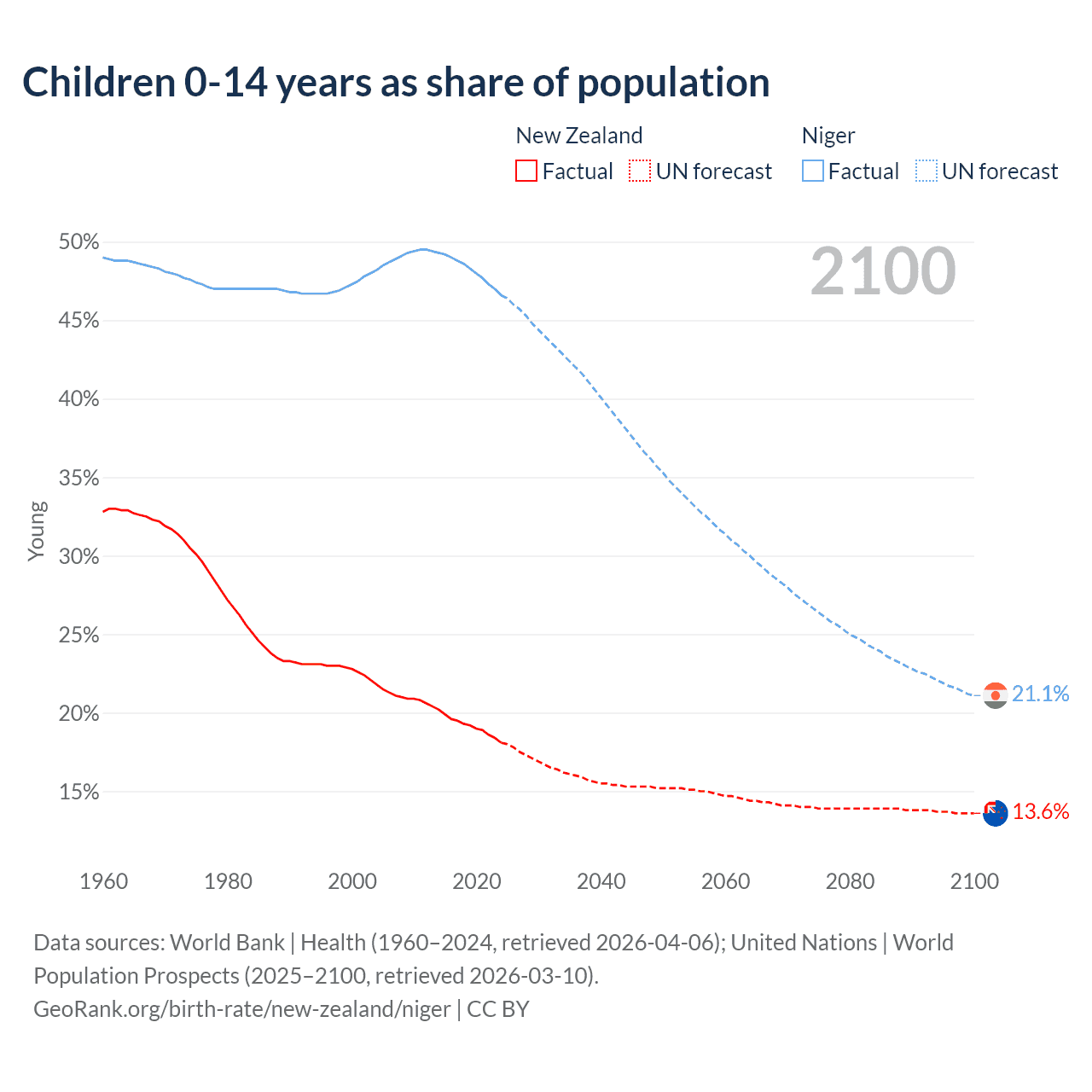 According to the latest available data on birth rates, the fertility rate in New Zealand was 1.56 children per woman in 2023, compared to 6.06 in Niger in 2023. The replacement level is considered to be 2.1 children per woman.