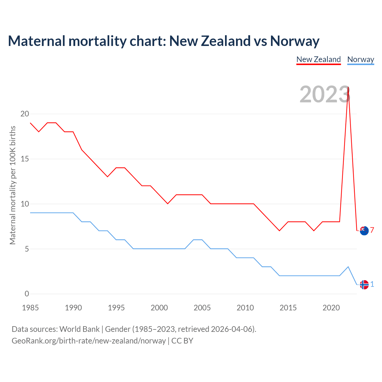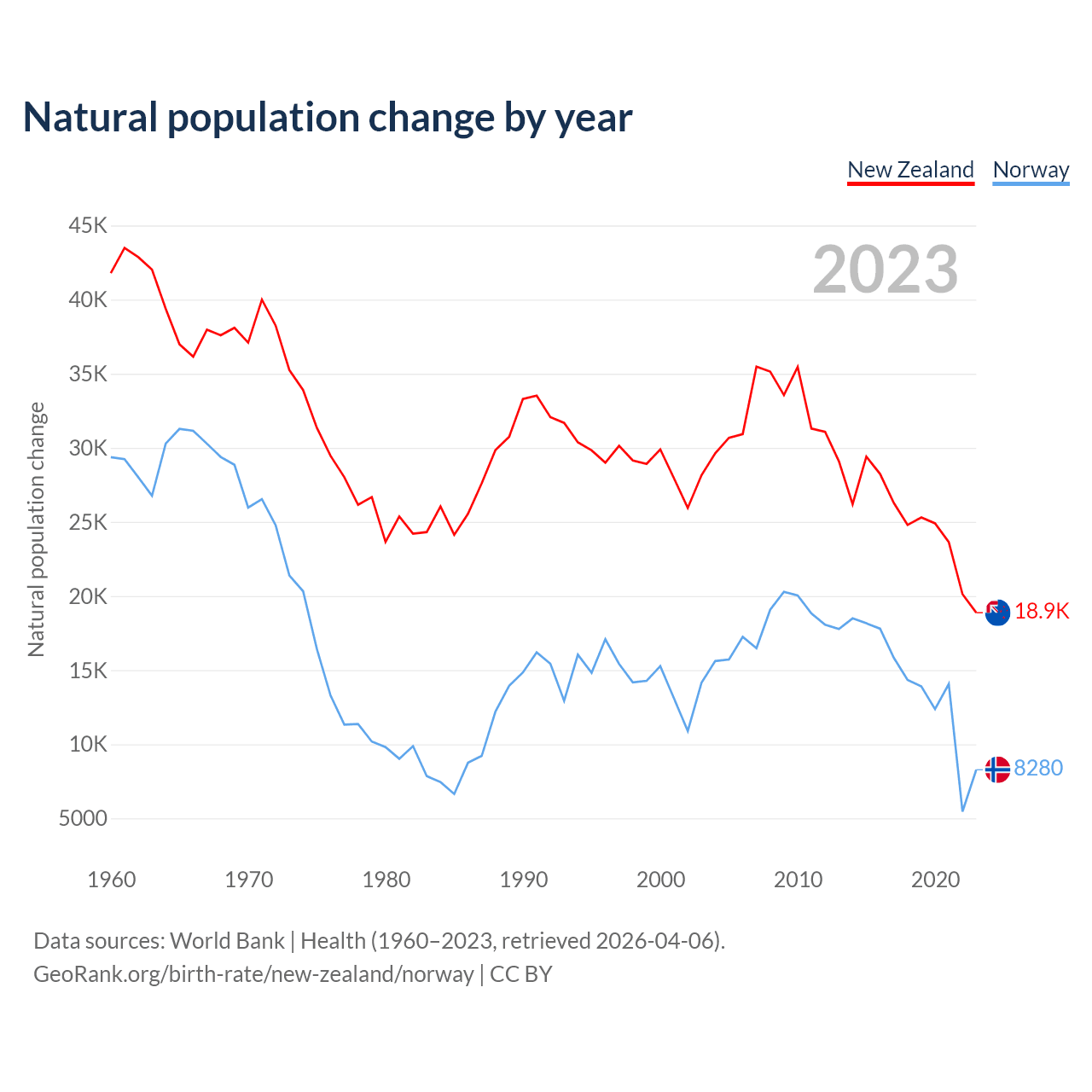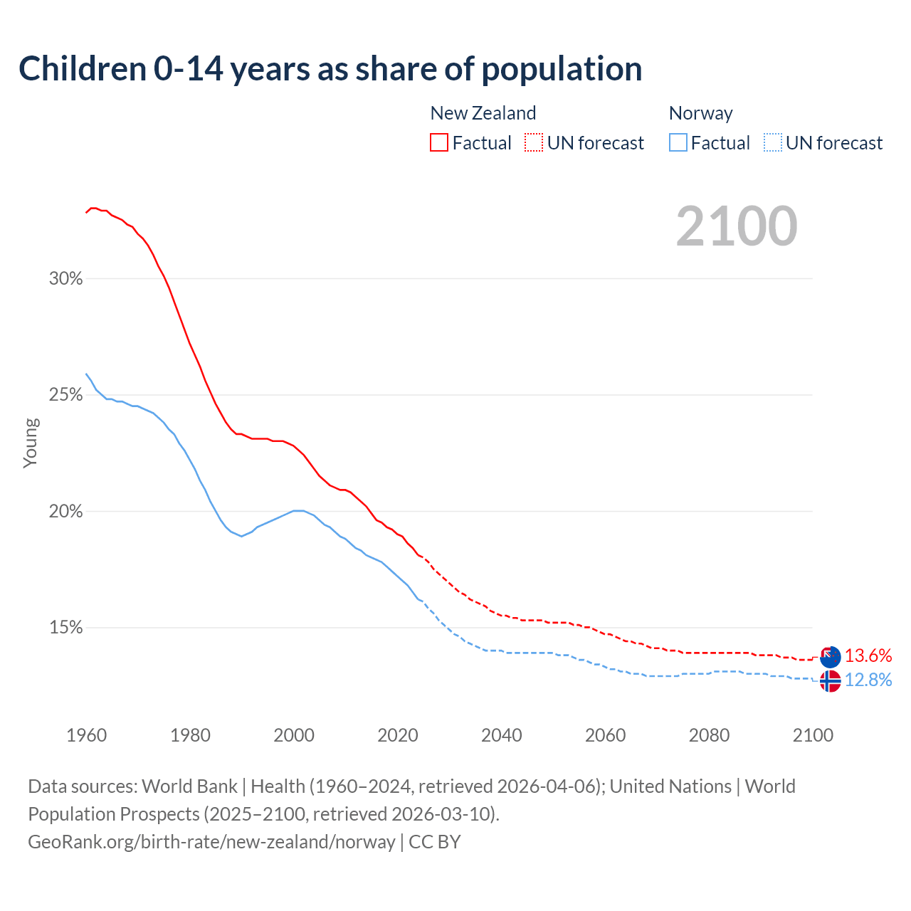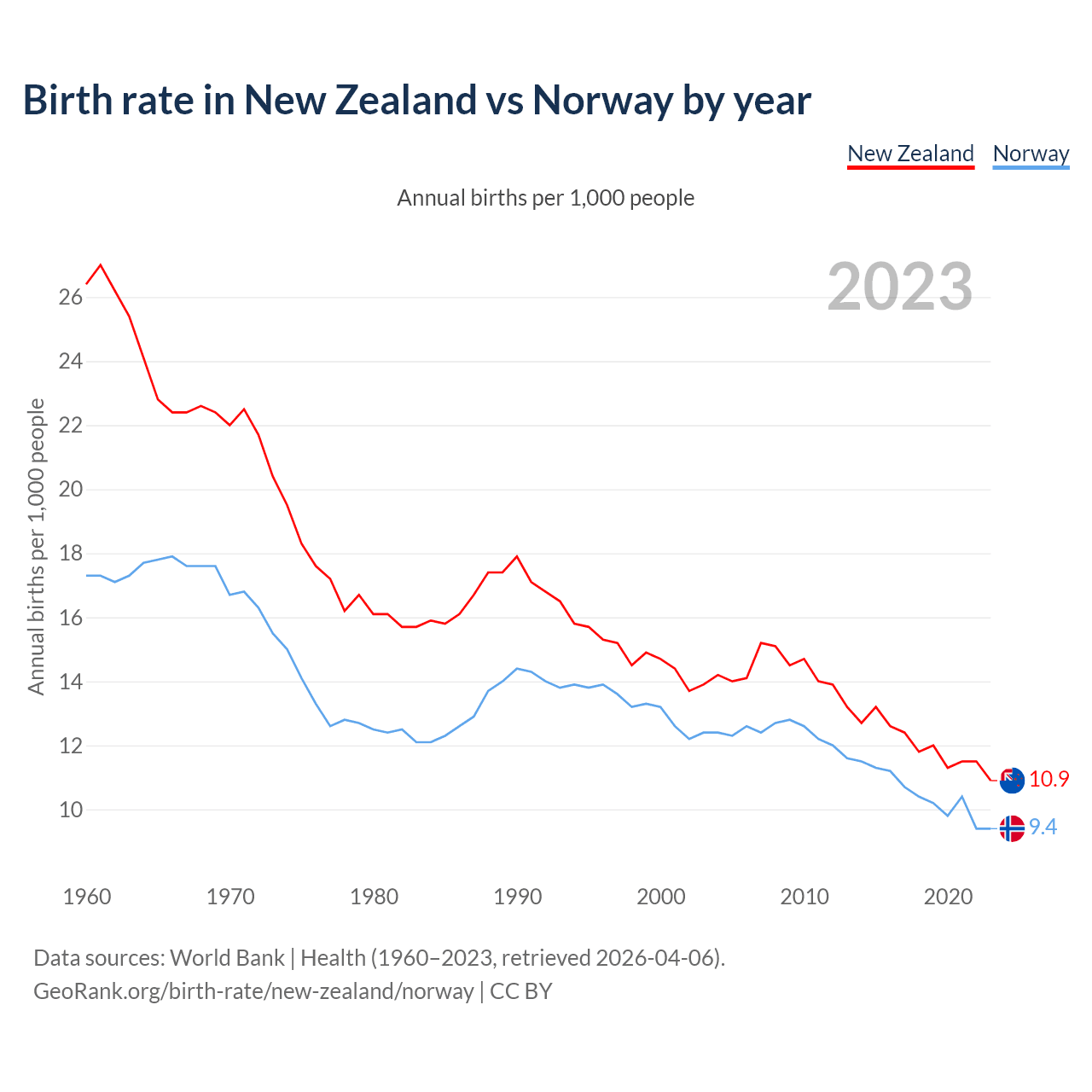 According to the latest available data on birth rates, the fertility rate in New Zealand was 1.56 children per woman in 2023, compared to 1.4 in Norway in 2023. The replacement level is considered to be 2.1 children per woman.