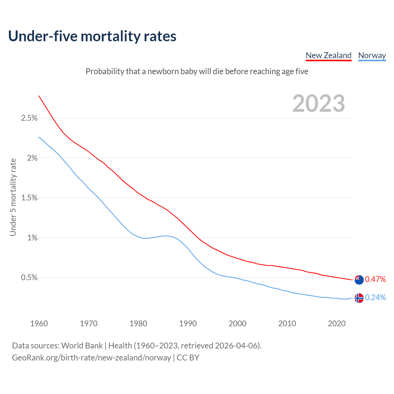 The chance that a newborn baby will die before reaching age five is 0.47% in New Zealand and 0.24% in Norway. Above is a chart with historical data on under-five mortality rates.