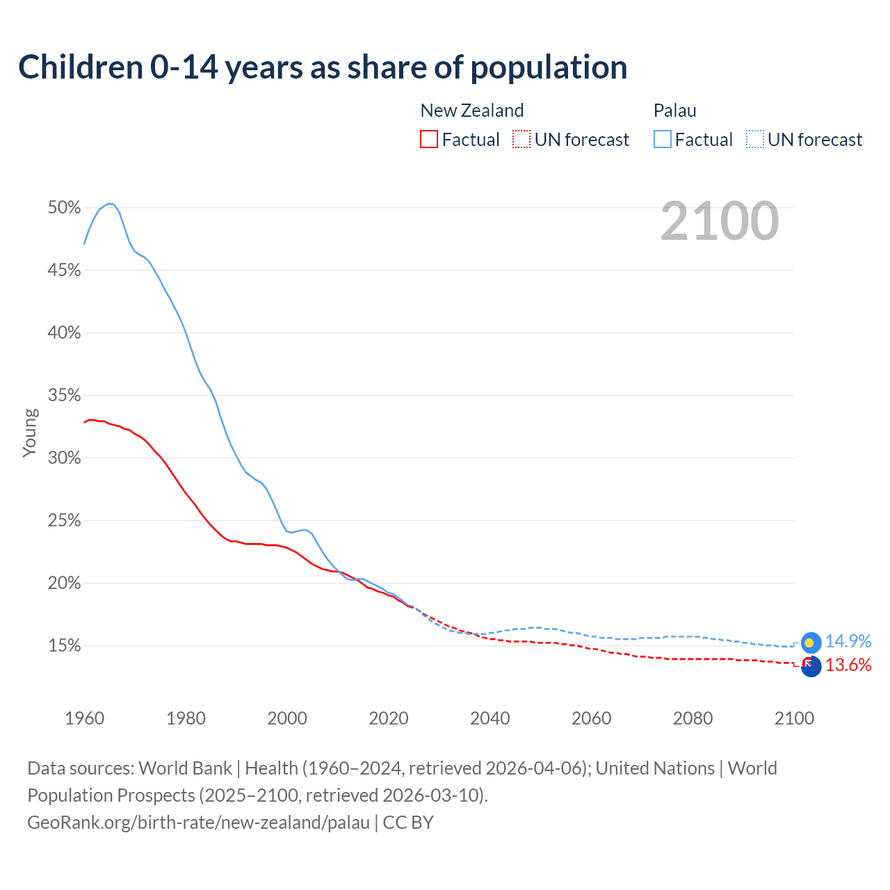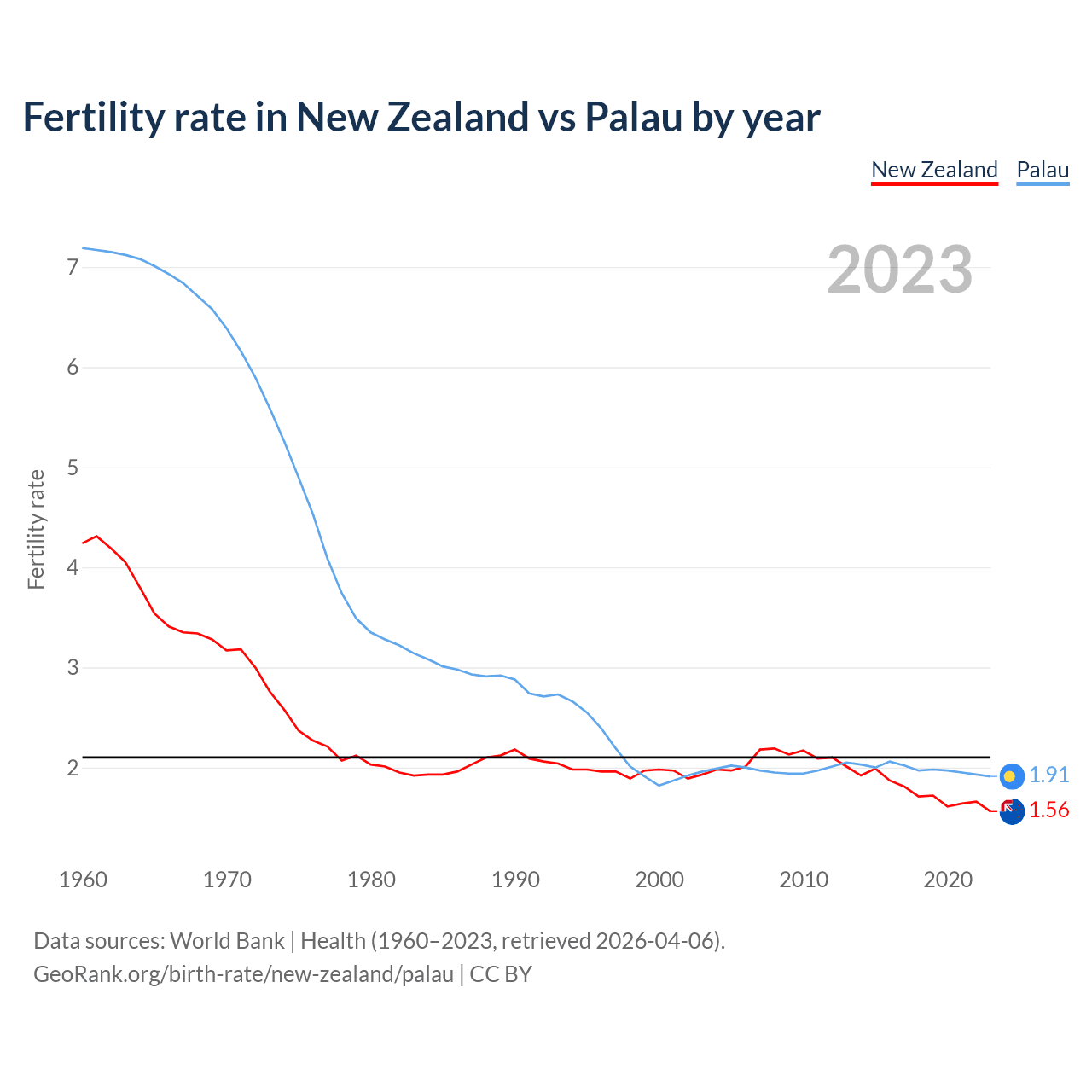 According to the latest available data on birth rates, the fertility rate in New Zealand was 1.56 children per woman in 2023, compared to 1.91 in Palau in 2023. The replacement level is considered to be 2.1 children per woman.