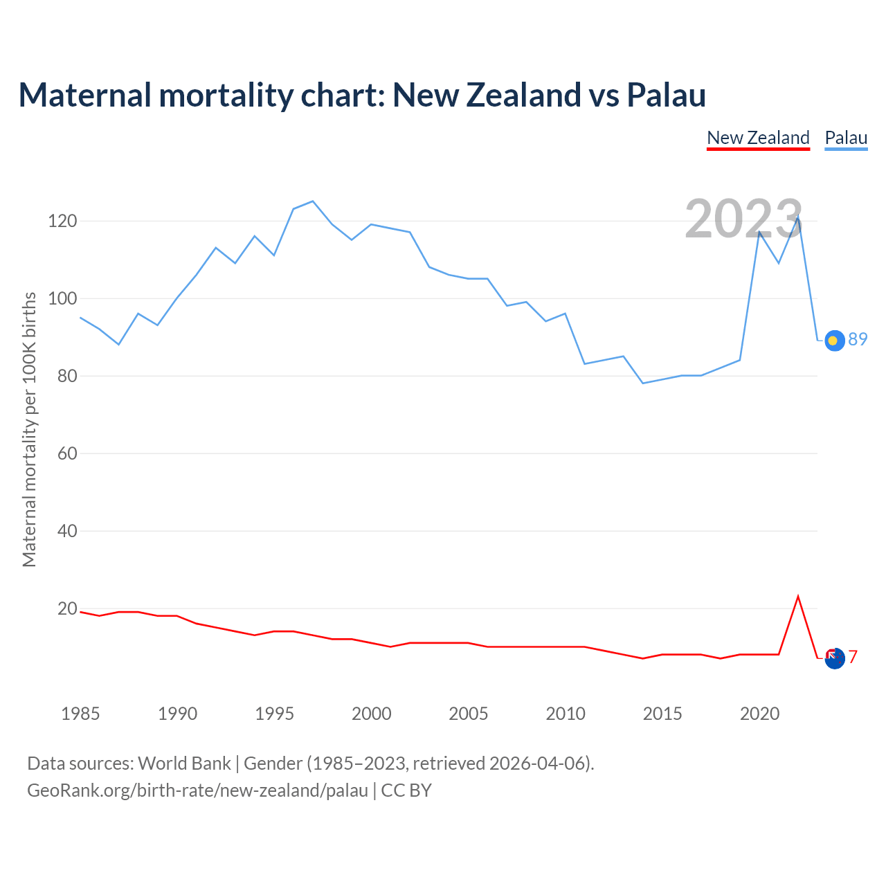The maternal mortality rate, which is the probability of dying during childbirth or within 42 days of pregnancy termination, is 7 deaths per 100,000 live births in New Zealand, compared to 89 deaths in Palau.