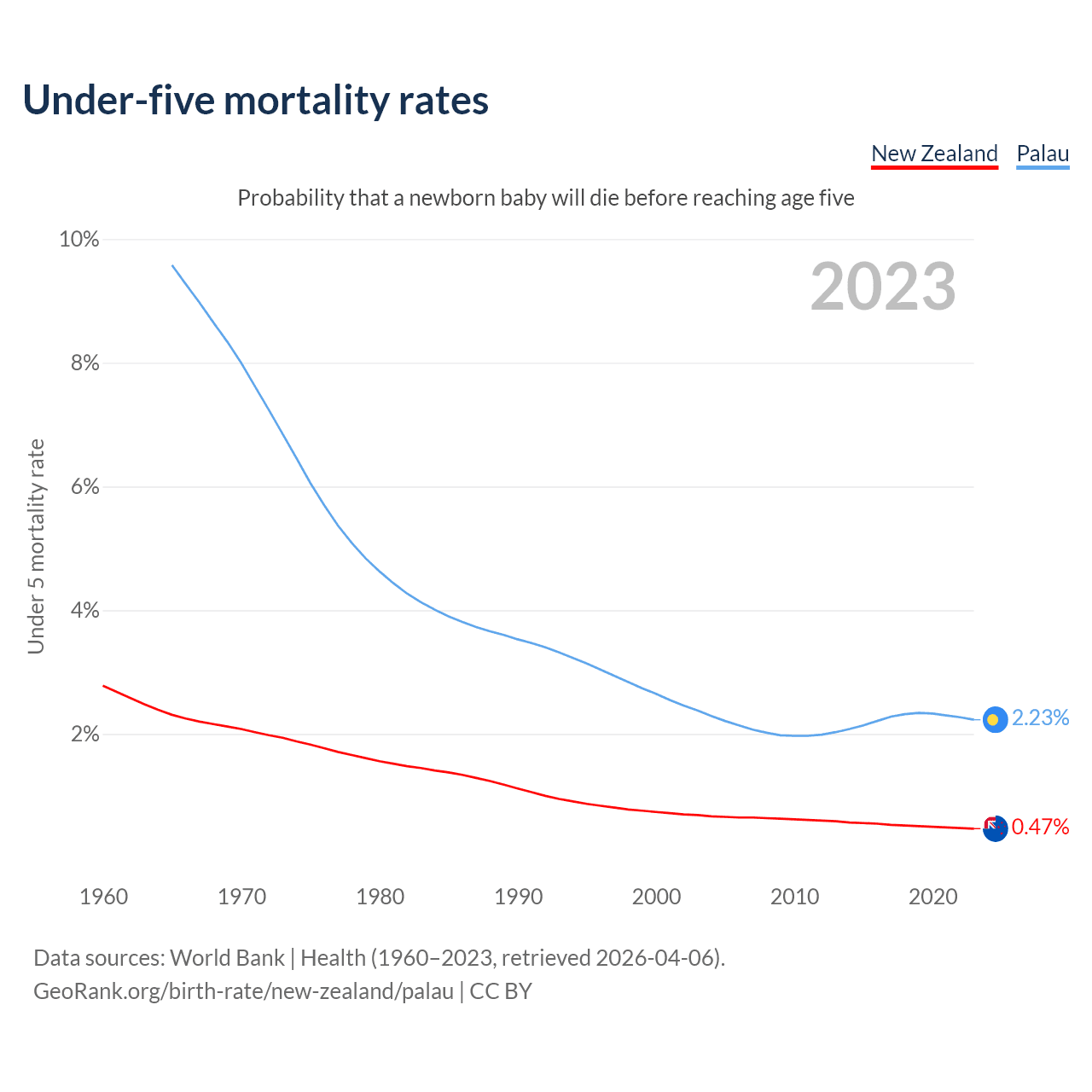 The chance that a newborn baby will die before reaching age five is 0.47% in New Zealand and 2.23% in Palau. Above is a chart with historical data on under-five mortality rates.