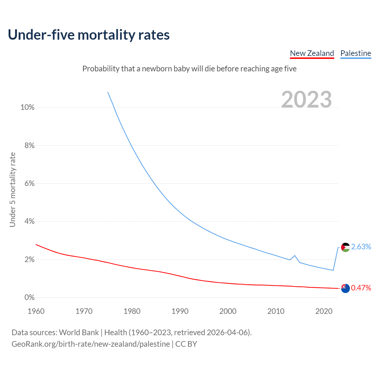 The chance that a newborn baby will die before reaching age five is 0.47% in New Zealand and 2.63% in Palestine. Above is a chart with historical data on under-five mortality rates.