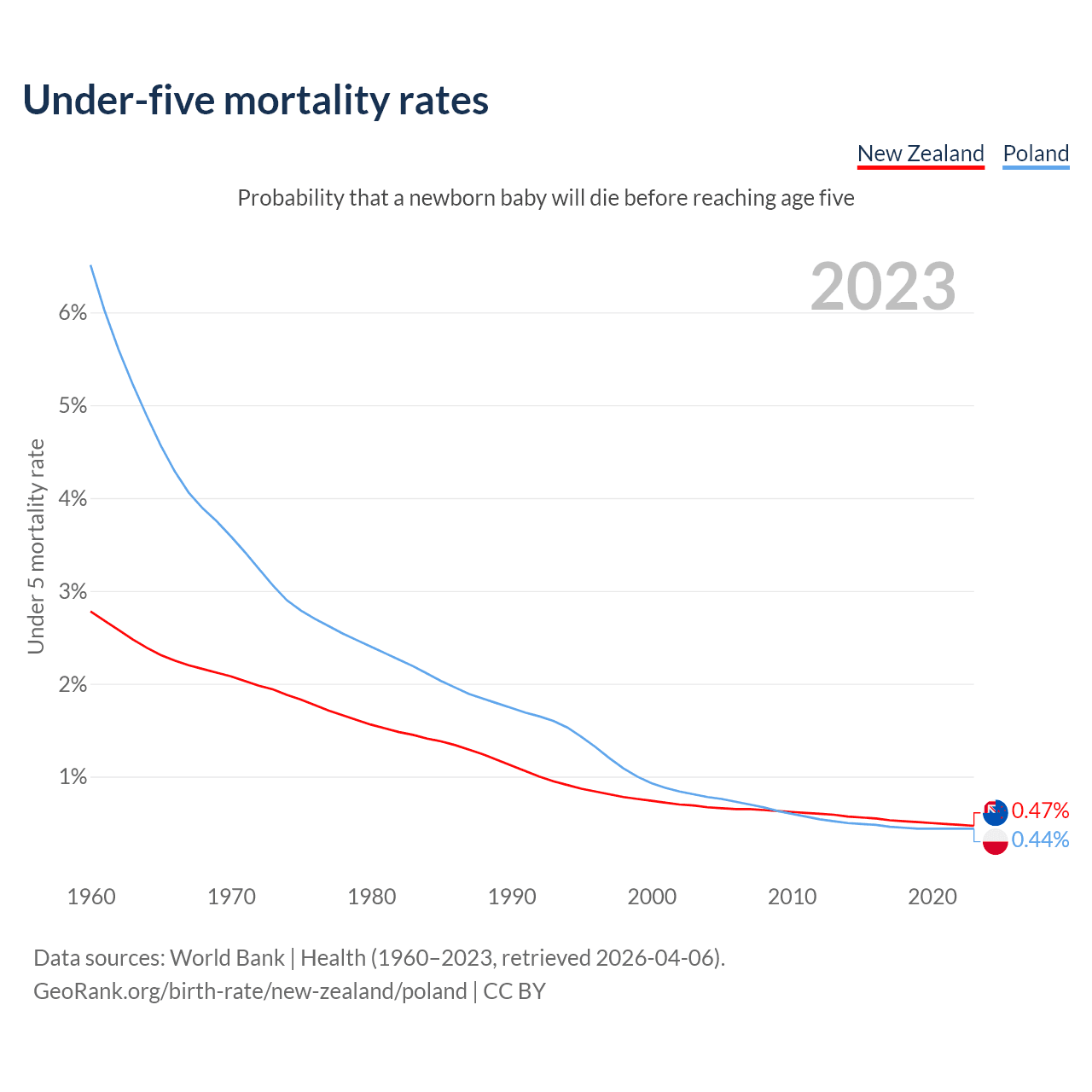 The chance that a newborn baby will die before reaching age five is 0.47% in New Zealand and 0.44% in Poland. Above is a chart with historical data on under-five mortality rates.