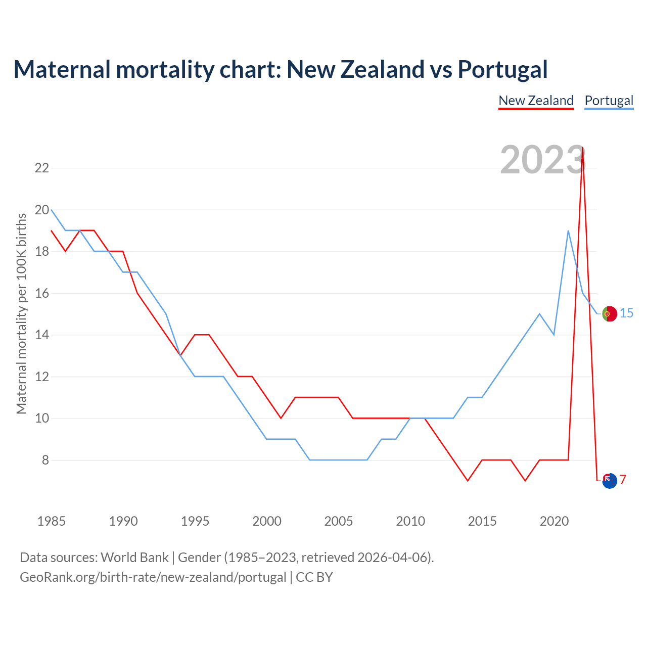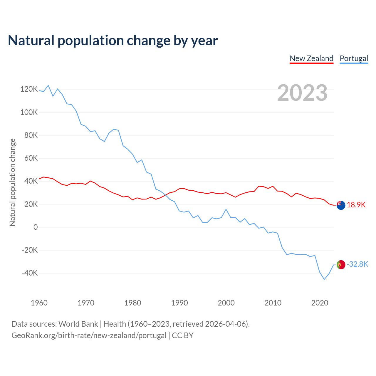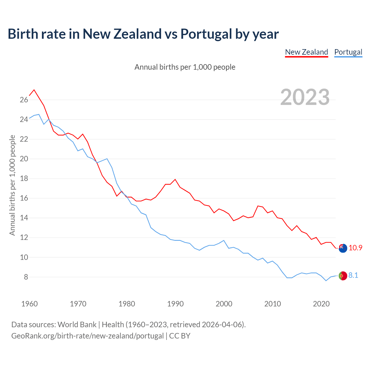 According to the latest available data on birth rates, the fertility rate in New Zealand was 1.56 children per woman in 2023, compared to 1.44 in Portugal in 2023. The replacement level is considered to be 2.1 children per woman.