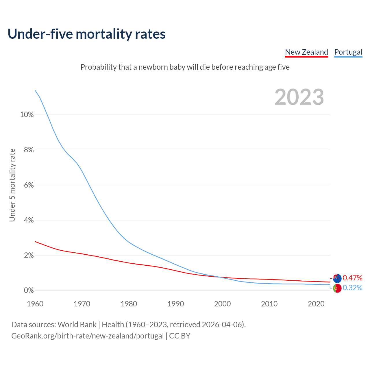 The chance that a newborn baby will die before reaching age five is 0.47% in New Zealand and 0.32% in Portugal. Above is a chart with historical data on under-five mortality rates.