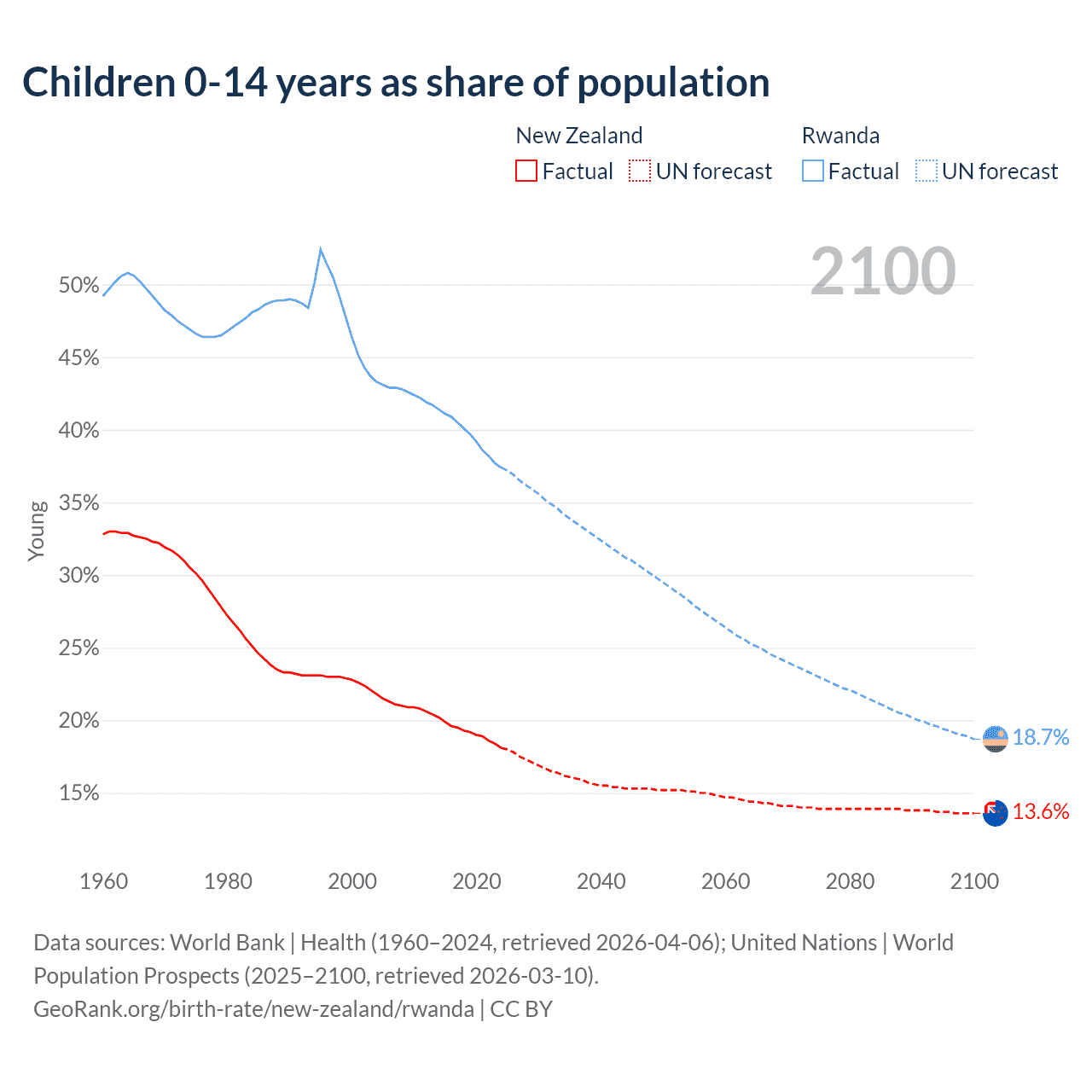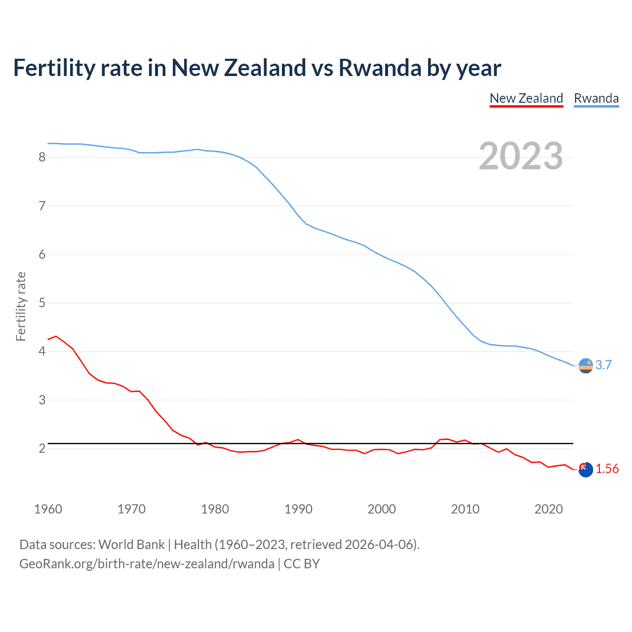 According to the latest available data on birth rates, the fertility rate in New Zealand was 1.56 children per woman in 2023, compared to 3.7 in Rwanda in 2023. The replacement level is considered to be 2.1 children per woman.