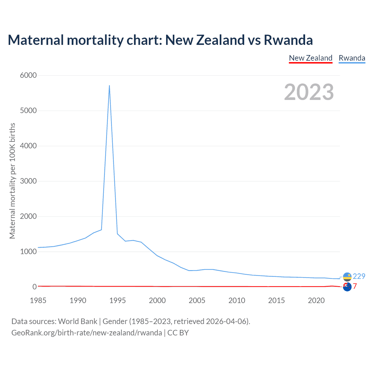 The maternal mortality rate, which is the probability of dying during childbirth or within 42 days of pregnancy termination, is 7 deaths per 100,000 live births in New Zealand, compared to 229 deaths in Rwanda.
