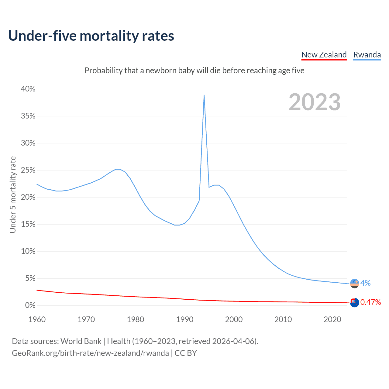 The chance that a newborn baby will die before reaching age five is 0.47% in New Zealand and 4% in Rwanda. Above is a chart with historical data on under-five mortality rates.