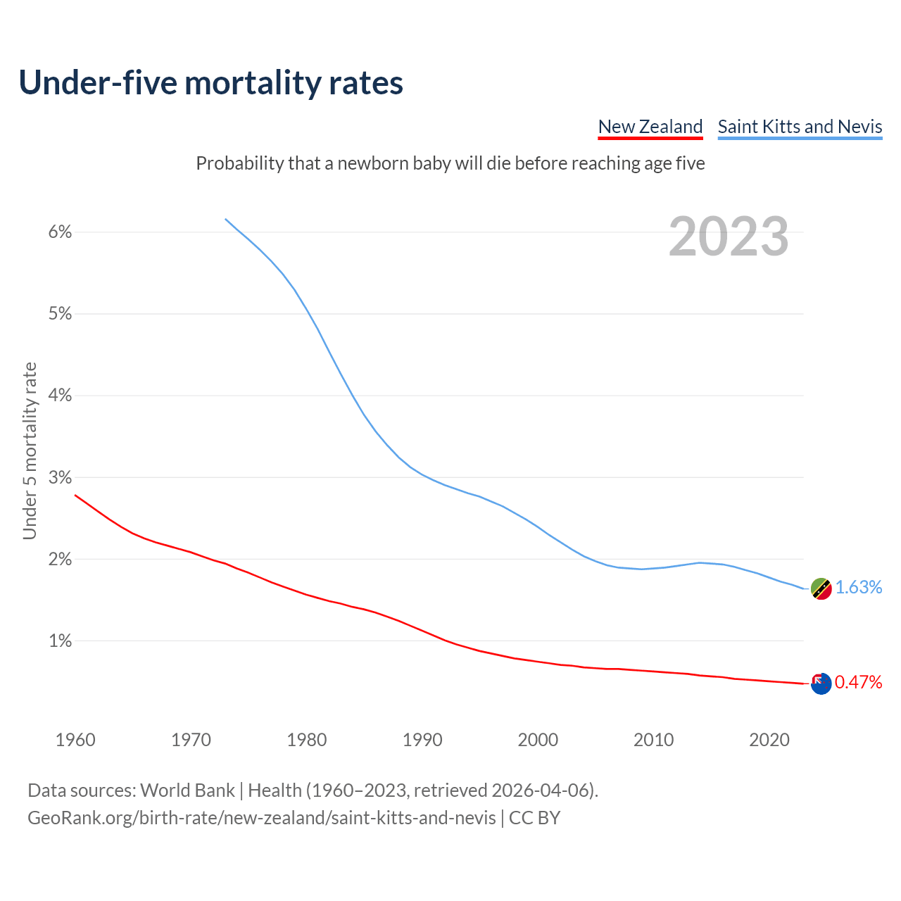 The chance that a newborn baby will die before reaching age five is 0.47% in New Zealand and 1.63% in Saint Kitts and Nevis. Above is a chart with historical data on under-five mortality rates.
