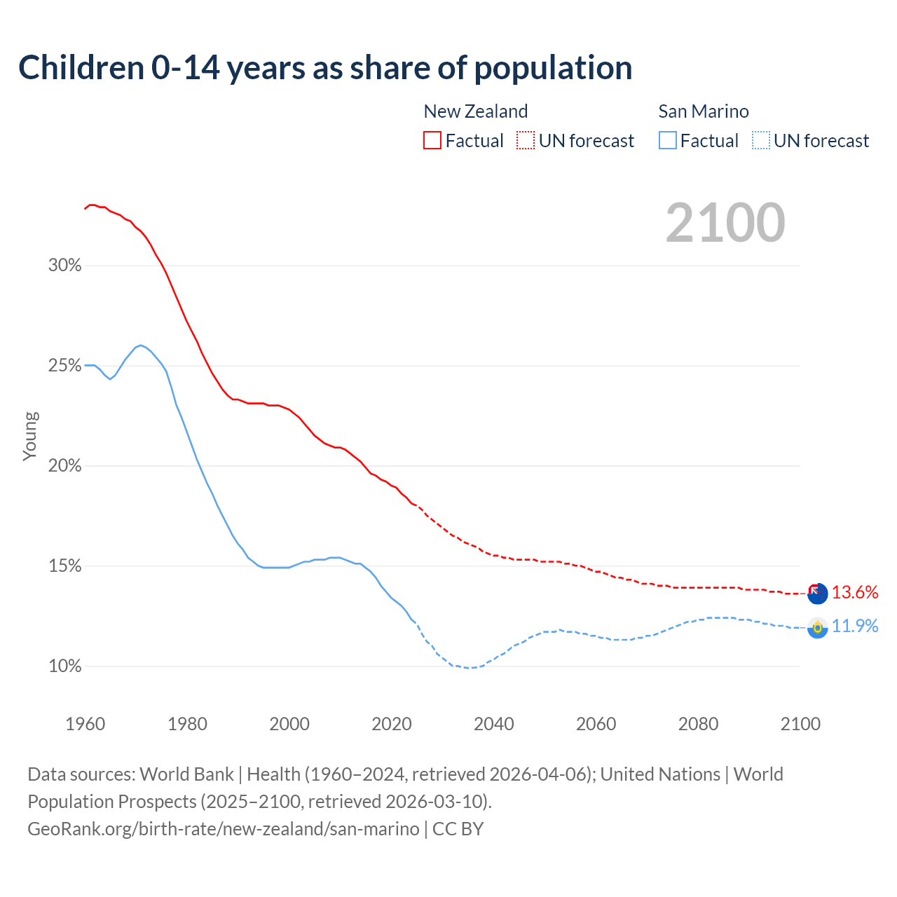 According to the latest available data on birth rates, the fertility rate in New Zealand was 1.56 children per woman in 2023, compared to 1.15 in San Marino in 2023. The replacement level is considered to be 2.1 children per woman.