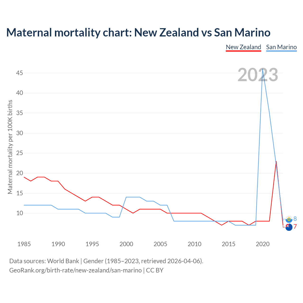 The maternal mortality rate, which is the probability of dying during childbirth or within 42 days of pregnancy termination, is 7 deaths per 100,000 live births in New Zealand, compared to 8 deaths in San Marino.