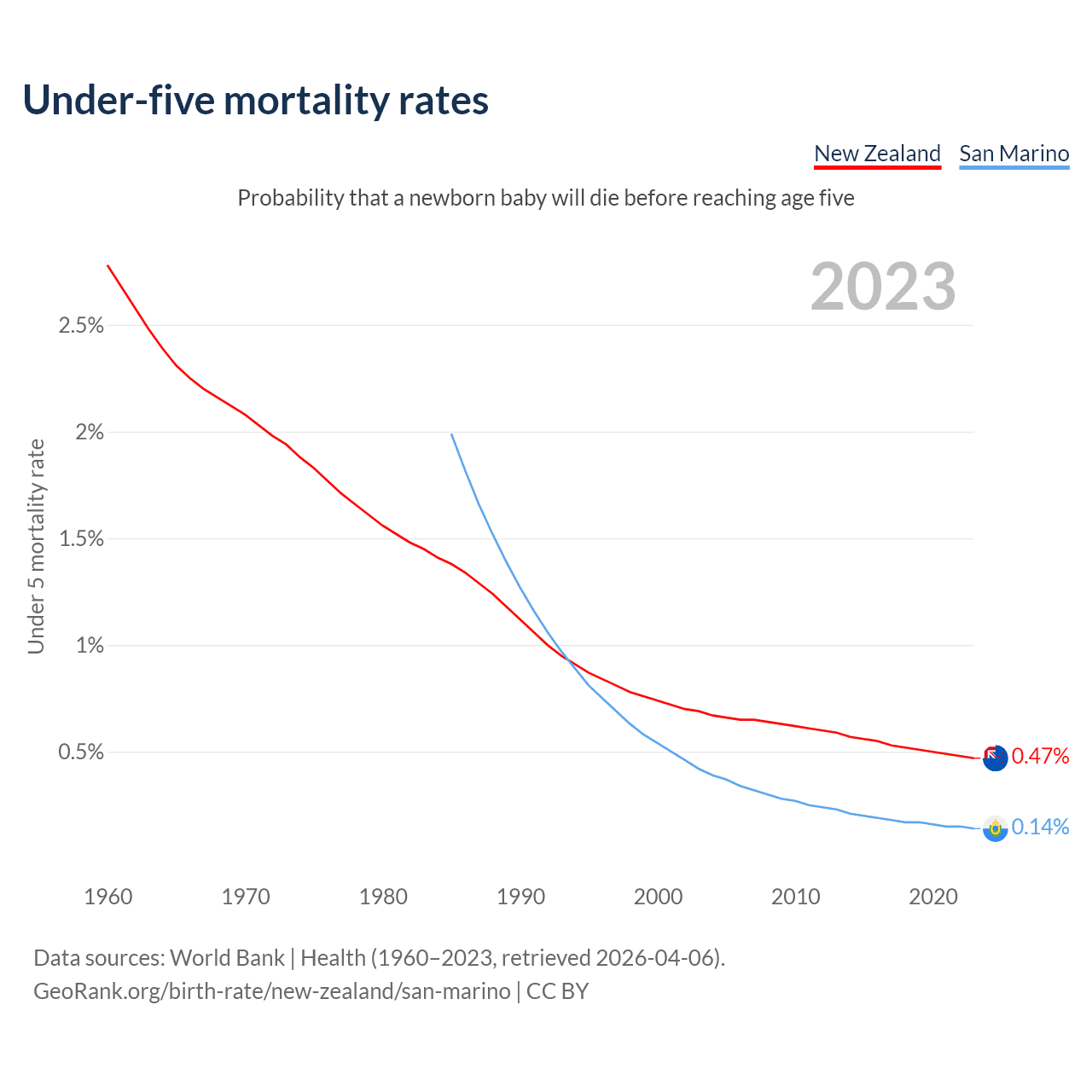 The chance that a newborn baby will die before reaching age five is 0.47% in New Zealand and 0.14% in San Marino. Above is a chart with historical data on under-five mortality rates.