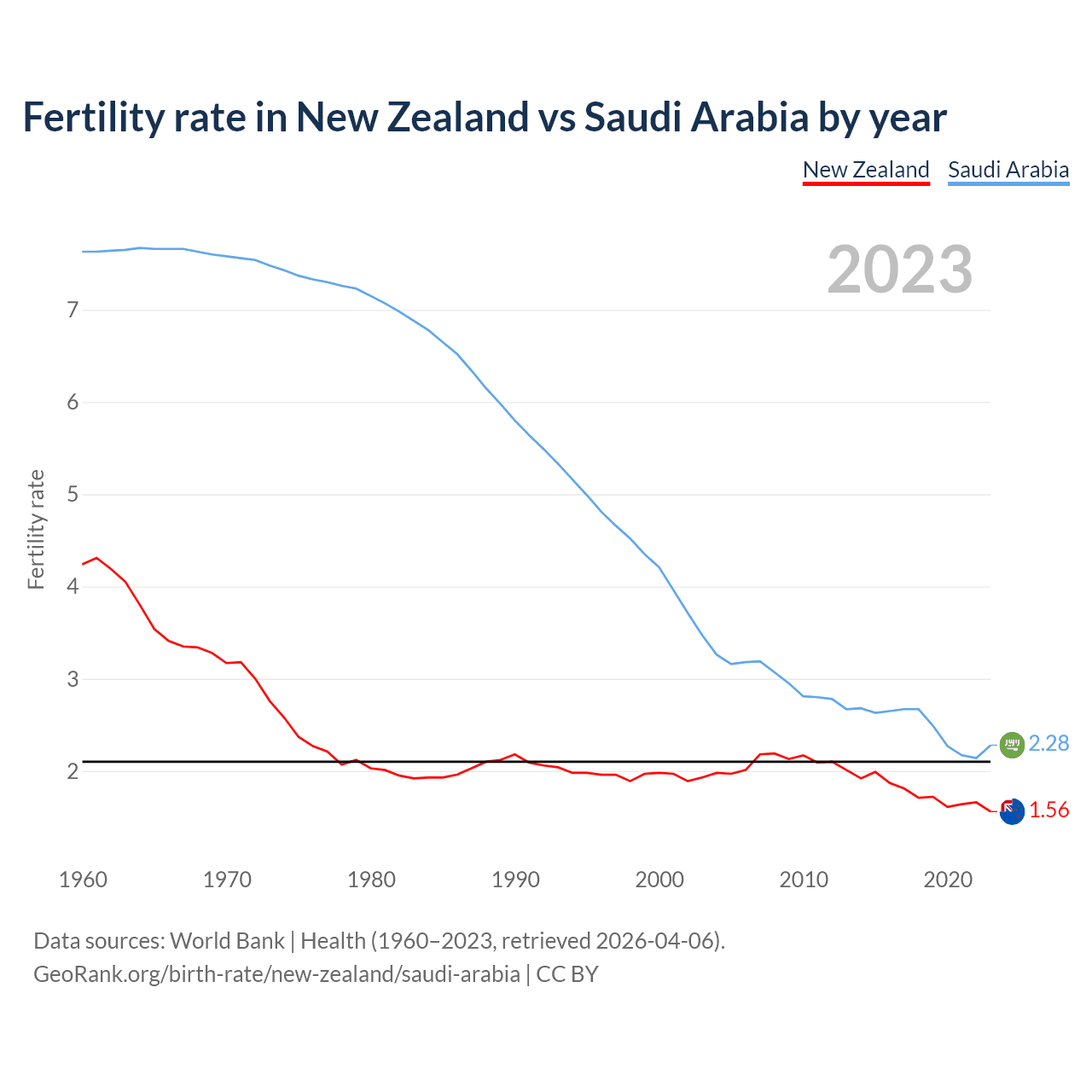According to the latest available data on birth rates, the fertility rate in New Zealand was 1.56 children per woman in 2023, compared to 2.28 in Saudi Arabia in 2023. The replacement level is considered to be 2.1 children per woman.