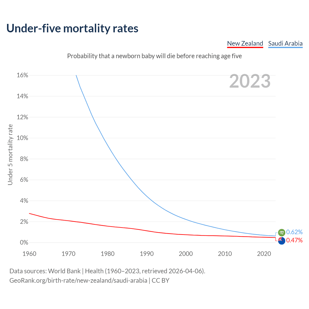 The chance that a newborn baby will die before reaching age five is 0.47% in New Zealand and 0.62% in Saudi Arabia. Above is a chart with historical data on under-five mortality rates.